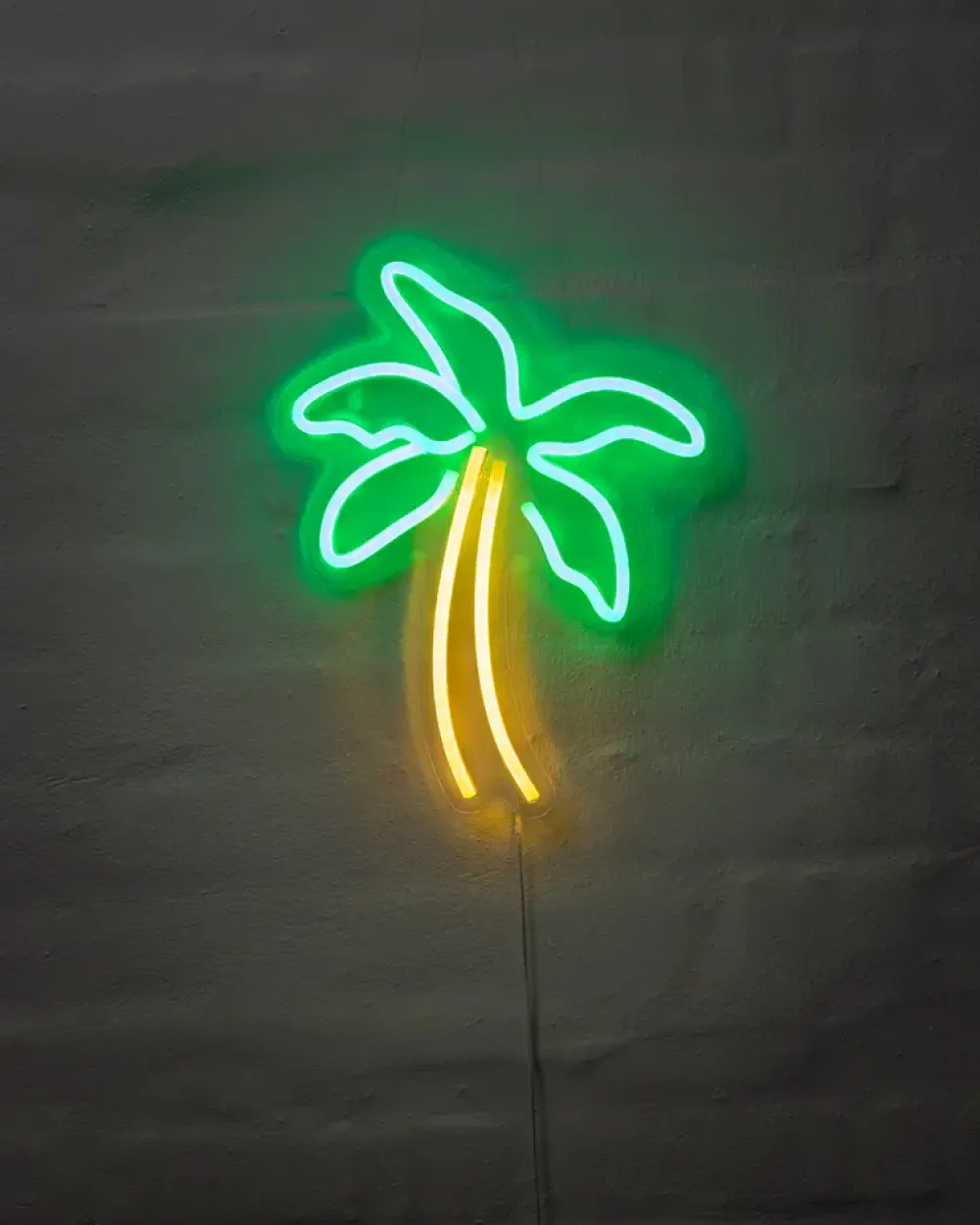 Dekorér dit hjem med dette fine lysskilt, som lyser op i mørket med sin grønne og gule farve, der fremhæver palmetræet.Lysskiltet kan hænges op på væggen.Væglampen er en fed og unik lampe, der både spreder god stemning i dit hjem i de sene aftentimer, og giver et godt og hyggeligt lys.Ledningen har en tænd/sluk knap.Bruges via en USB-port f.eks. på PC eller i en mobiloplader.