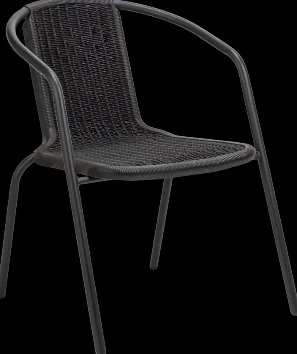 Enkel, stabelbar caféstol i sort pulverlakeret stålstel.Ryg og sæde er i behageligt og vejrbestandigt rattanplast.