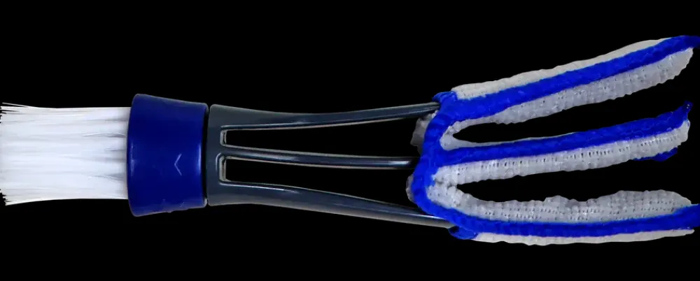 Multifunktionel rengøringsbørste med to hoveder til effektiv rengøring af svært tilgængelige steder. Velegnet til persienner, vinduesrammer, ventilationsåbninger, aircondition og andre snævre områder, hvor almindelige redskaber ikke rækker.Det ene børstehoved har stive, hvide børstehår. Det andet har tre fleksible rengøringsfingre med mikrofiberbetræk, der opsamler støv og snavs.Det grå plastikhåndtag giver godt greb og sikrer nem og kontrolleret rengøring. Børsten måler 16 cm og er nem at håndtere og opbevare.Farver: grå, blå og hvid. Fremstillet af slidstærk PP-plast og mikrofiber, som tåler gentagen brug.