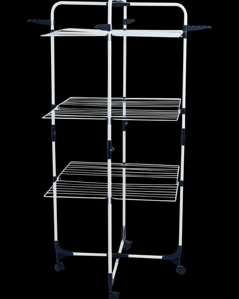 Tørrestativ med 3 niveauer og hjul giver fleksibel tørring af tøj i hjemmet. Konstruktionen har 30 meter tørreplads fordelt på flere etager, hvilket giver god kapacitet til både små og større vaskemængder. De integrerede hjul gør det muligt at flytte stativet mellem rum, også når det er i brug.Stativet kan anvendes til daglig tørring af tøj, håndklæder og mindre tekstiler. Den lodrette opbygning udnytter højden i rummet og egner sig til placering i bryggers, badeværelse eller på altan. Efter brug kan det foldes fladt sammen, så det fylder minimalt ved opbevaring.Stellet er fremstillet i stål med plastdetaljer. Farve: hvid og sort.Mål: H. 136 x B. 65 x D. 70 cm.Tørreplads: 30 meter.Materiale: stål og plast.
