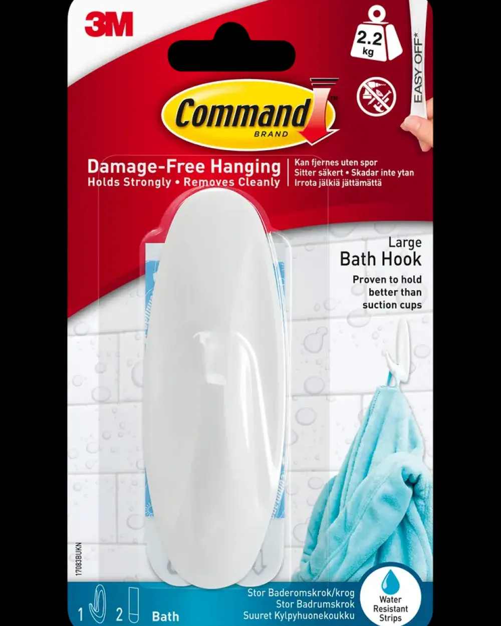 Command™ designerkrog til vådrum anvendes til ophængning af håndklæder og badeudstyr i badeværelset uden brug af boring eller værktøj. Krogen er beregnet til brug i våde, fugtige og tørre omgivelser og giver en løsning, hvor overflader bevares uden huller og mærker.Montering sker med vandbestandige klæbestrips, som hæfter på fliser, malede vægge, træ, glas og metal. Krogen kan bruges i bruseniche, ved håndvask eller andre områder, hvor der stilles krav til modstandsdygtighed over for fugt. Ved korrekt montering kan krogen bære op til 2,2 kg og er egnet til daglig brug i badeværelset.Når krogen ikke længere skal anvendes, kan stripsene fjernes igen uden at efterlade klæberester. Den hvide overflade passer ind i de fleste badeværelsesindretninger. Sættet indeholder 1 stor krog og vandbestandige strips.Farve: HvidMateriale: PlastBæreevne: 2,2 kgStriptype: Vandbestandig