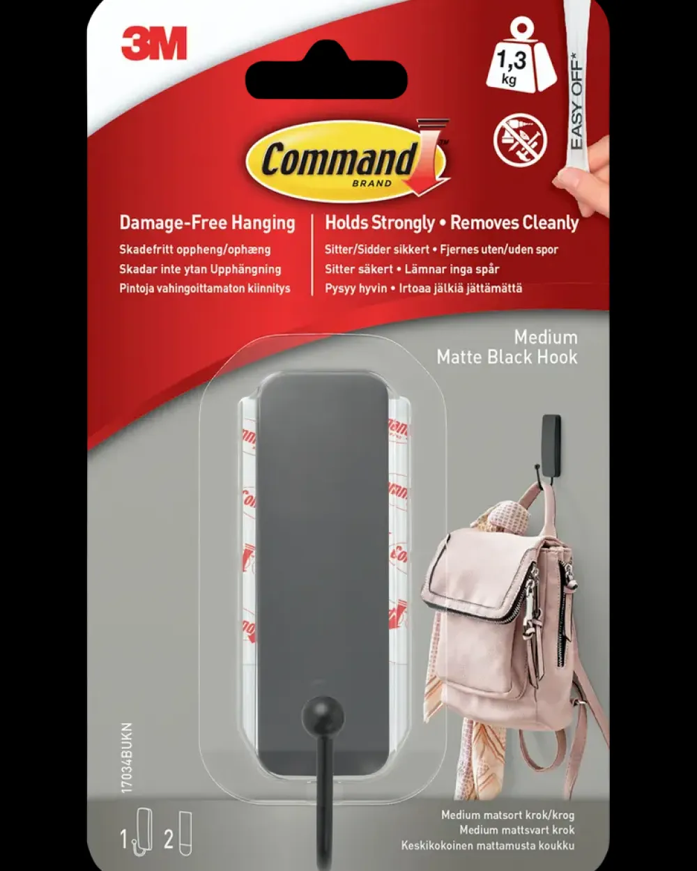 Command™ krog i matsort metal er beregnet til indendørs ophængning af genstande som tasker, punge, tøj og let udstyr. Krogen monteres uden brug af søm, skruer eller værktøj og gør det muligt at hænge ting op på glatte overflader uden at beskadige væggen.Krogen fastgøres med Command™ selvklæbende strips, som sikrer stabilt ophæng på blandt andet malede vægge, behandlet træ, glas, fliser og metal. Når krogen fjernes igen, efterlades overfladen uden huller, mærker eller klæberester. Det gør løsningen velegnet til både hjemmet, kontoret og garderoben, hvor indretningen ofte ændres.Den mellemstore krog har en bæreevne på op til 1,3 kg og egner sig til daglig organisering, hvor der er behov for både funktion og fleksibilitet. Den matsorte overflade giver et enkelt og diskret udtryk, som passer ind i mange typer rum og indretninger.Tekniske detaljer:Bæreevne: op til 1,3 kgAnvendelse: IndendørsMontering: Selvklæbende stripsFarve: Sort (matsort)Materiale: Metal