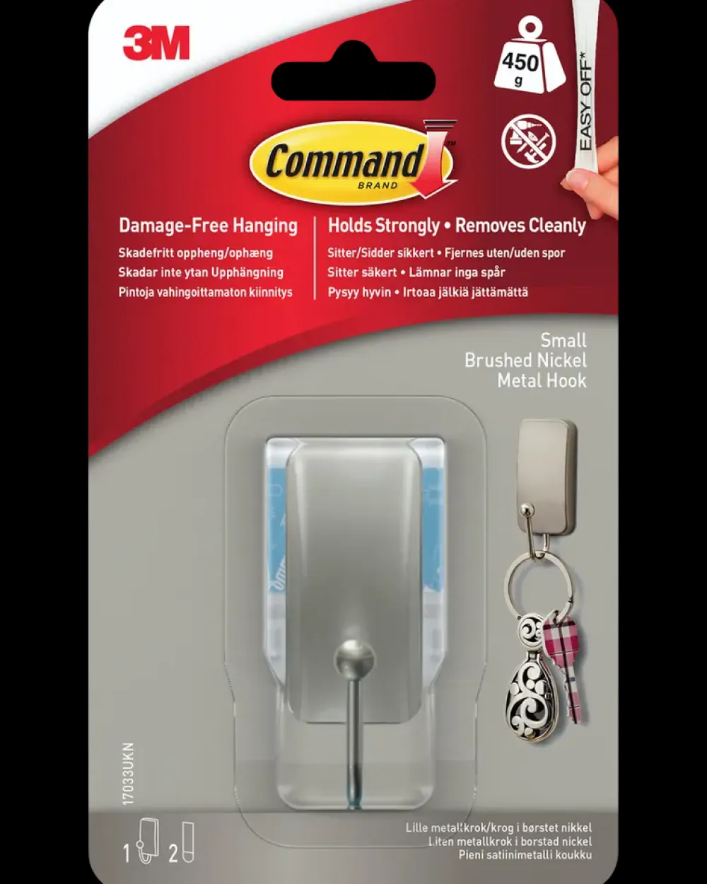 Command™ krog i børstet nikkel er beregnet til indendørs ophængning af mindre genstande som nøgler, punge, tasker og let udstyr. Krogen monteres uden brug af søm, skruer eller værktøj og giver mulighed for ophæng på glatte overflader uden at beskadige væggen.Krogen fastgøres med to medfølgende Command™ strips, som sikrer stabilt ophæng på blandt andet malede vægge, glas, træ, fliser og metal. Når krogen fjernes igen, efterlades overfladen uden huller, mærker eller klæberester. Det gør løsningen velegnet til både hjemmet, kontoret og garderoben, hvor indretningen ofte ændres.Den lille krog har en bæreevne på op til 450 g og egner sig til daglig organisering, hvor der er behov for nem adgang og fleksibel placering. Tekniske detaljer:Bæreevne: op til 450 gAnvendelse: IndendørsMontering: Selvklæbende stripsAntal strips: 2 stk.Materiale: Nikkel