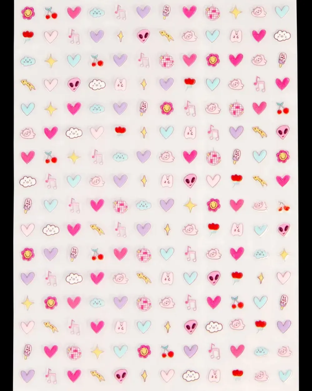 Neglestickers giver mulighed for hurtig udsmykning af neglene med små farverige motiver. Arket rummer et bredt udvalg af figurer, som kan bruges til at skabe individuelle udtryk. Produktet henvender sig især til børn fra 6 år og opefter, men kan anvendes af alle, der ønsker enkel negledekor.Stickersene påføres på tør neglelak eller direkte på neglens overflade. Motiverne omfatter blandt andet hjerter, blomster, is, stjerner, skyer, noter, kirsebær og små figurer i røde, pink, lilla, gule og lyseblå farver. Det store antal små motiver gør det muligt at variere dekorationen fra gang til gang.Arket indeholder langt over 100 små klistermærker. De leveres på et tyndt, gennemsigtigt underlag, som gør det let at udvælge og placere de ønskede motiver.Et tip er at forsegle stickersene med et lag klar lak for at opnå længere holdbarhed ved daglig brug.