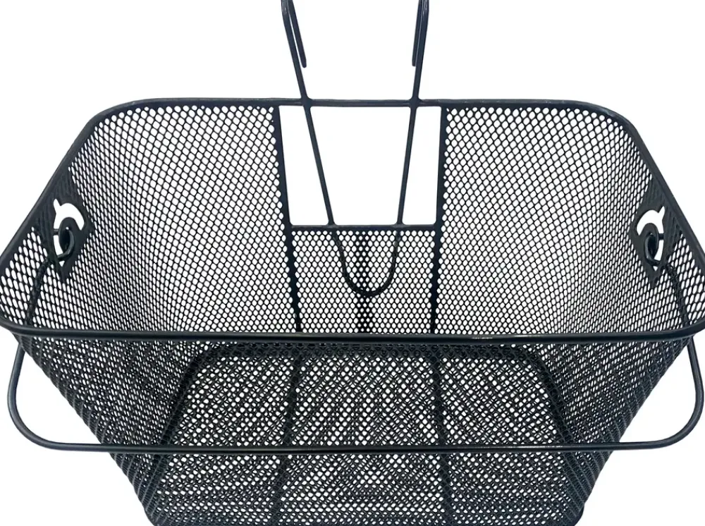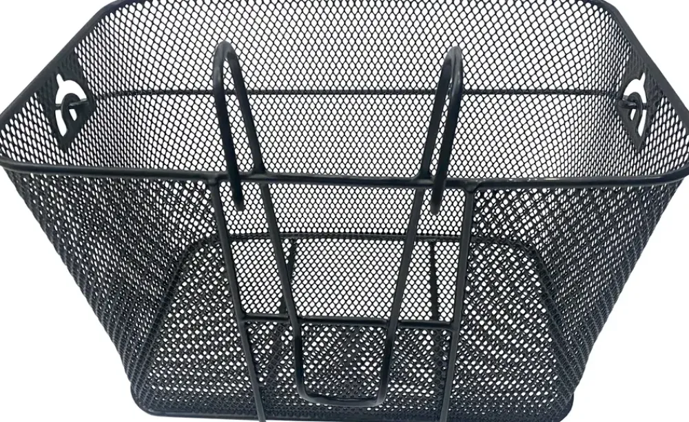 Praktisk cykelkurv til styret med integrerede kroge. Nem at montere og tage af – velegnet til daglig transport og småindkøb.Fremstillet i sortlakeret ståltråd for robusthed og holdbarhed. Det åbne netdesign giver overblik og ventilation.Med bærehåndtag – kan tages med ind i butik eller hjem.Mål: 37 x 33 x 26 cm – rummelig løsning til hverdagsbrug. Passer til mange cykeltyper.