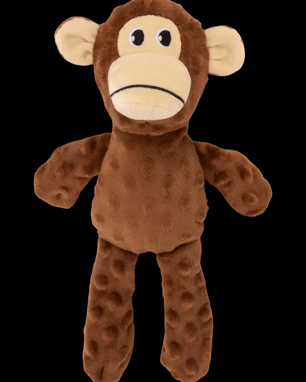 Denne søde abe-bamse til hunde er både sjov og tryg at lege med. Med sine 32 x 20 cm passer den godt til små og mellemstore hunde, der holder af at lege, bide og kramme deres legetøj. Bamsen er fremstillet af blød polyester og har en knasende tekstur indeni, som giver ekstra sensorisk stimulering og gør legen mere spændende.Den venlige abe har en struktureret overflade, der føles rar i munden og er skånsom mod tænderne. Kombinationen af blødhed og lyd gør legetøjet til et godt valg til både aktiv leg og afslapning. Bamsen kan fungere som både aktivitetslegetøj og tryghedsbamse.