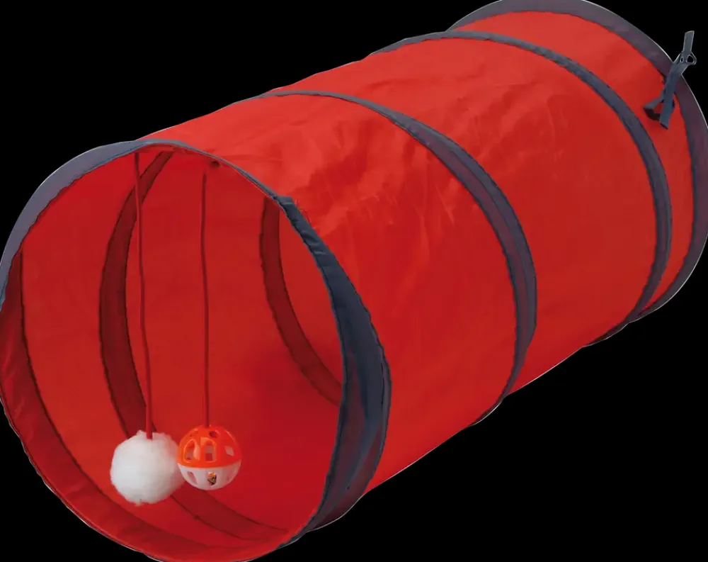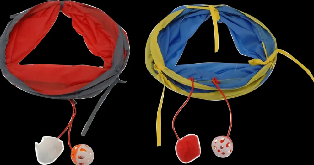 Pop-up kattetunnel i nylon med to hængende stykker legetøj, som stimulerer kattens naturlige jagt- og legeinstinkt. Tunnelen giver katte mulighed for at lege gemmeleg, jagte boldene eller hvile sig indeni.Tunnelen er fremstillet i let og slidstærkt nylon og kan foldes sammen, så den fylder minimalt, når den ikke er i brug. Legetøjet består af en blød plysbold og en raslebold i plast, som hænger fra tunnelens åbning og giver ekstra aktivitet.Med en længde på 51 cm og en diameter på 24,5 cm er tunnelen velegnet til både killinger og voksne katte.Kattetunnelen leveres assorteret i farverne rød med grå kant eller blå med gul kant.Farve: Rød/grå eller blå/gul (assorteret)Materiale: NylonMål: L 51 x Ø 24,5 cm