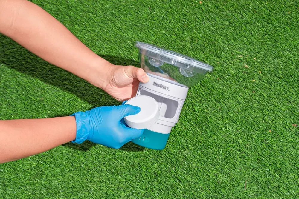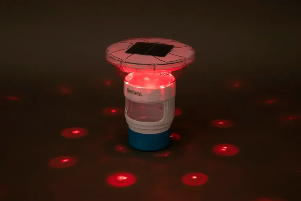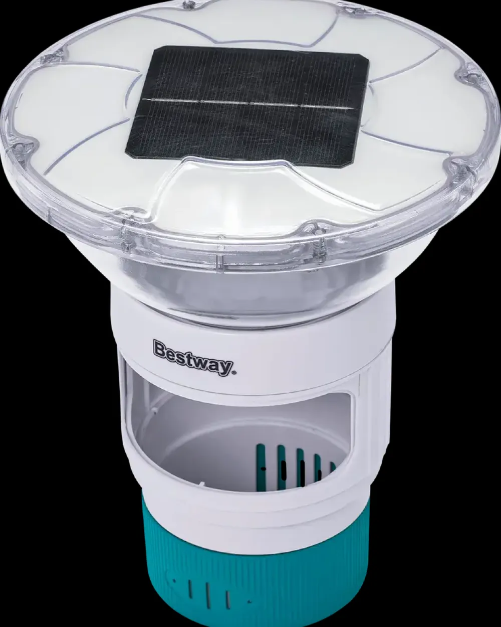 Flydende kemikaliedispenser til brug i pool, hvor klortabletter placeres i beholderen og opløses gradvist i vandet. Dispenseren kan anvendes med tabletter op til Ø 7,6 cm og fordeler kemien jævnt i bassinet.Enheden er forsynet med solcellepanel på toppen og indbygget LED-lys med flere farveindstillinger. Lyset kan skiftes via den medfølgende fjernbetjening og tænder automatisk i mørke.Beholderdelen har åbne riller, som giver gennemstrømning omkring tabletterne. Nederste del er blågrøn, mens kroppen er hvid med gennemsigtige elementer ved lysenheden. Toppen er udført i klar plast med synligt solcellefelt.Produktet fungerer uden ledning og kan benyttes i både små og større pools.
