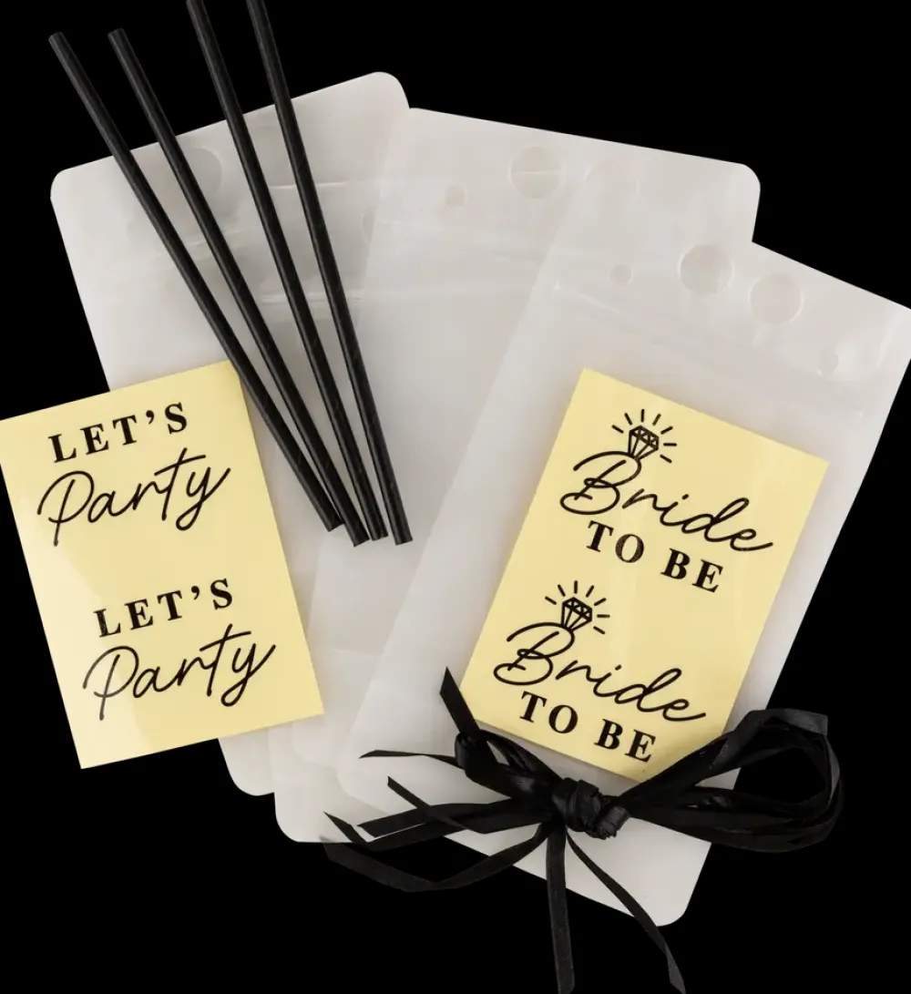 Drikkepose med sugerør og strop, teksten “Bride TO BE”.Tåler væske mellem 0-60 °C.