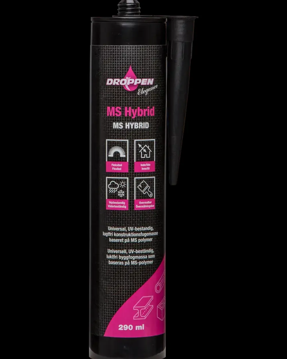 MS Hybrid er en universal, UV-bestandig, lugtfri og kemisk neutral konstruktionsfugemasse.Til fugning, fyldning og spartling af revner.Fugemassen hærder ved luftens fugtighed, og danner en stærk, elastisk fuge.Anvendes på bygningskonstruktioner, bygningselementer, døre, vinduer, paneler, karme, murværk, facader m.m.Kan overmales.