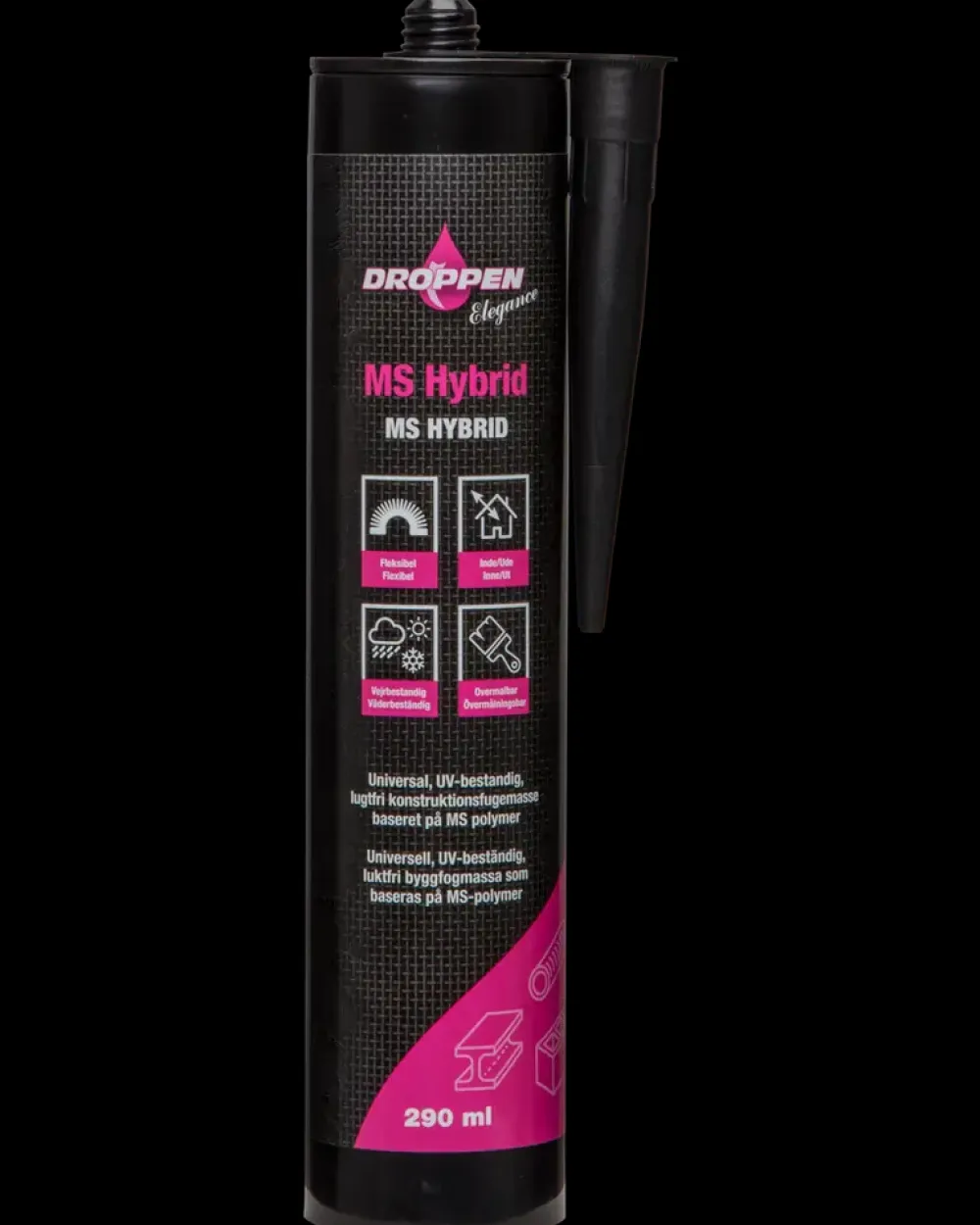 MS Hybrid er en universal, UV-bestandig, lugtfri og kemisk neutral konstruktionsfugemasse.Til fugning, fyldning og spartling af revner.Fugemassen hærder ved luftens fugtighed, og danner en stærk, elastisk fuge.Anvendes på bygningskonstruktioner, bygningselementer, døre, vinduer, paneler, karme, murværk, facader m.m.Kan overmales.