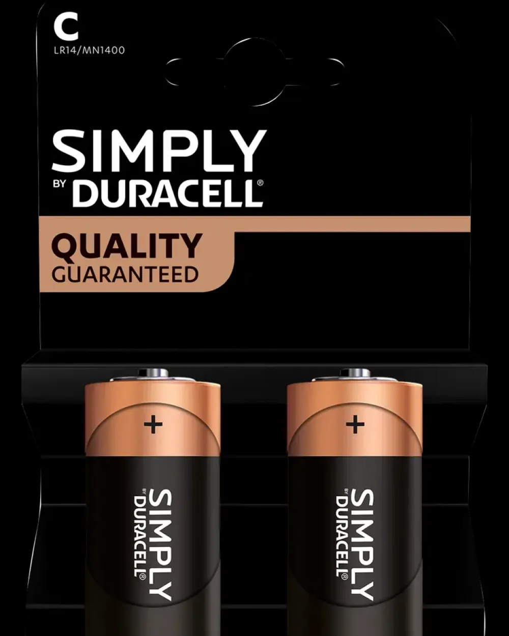 Duracell Simply alkaline C batterier – kvalitet garanteret til en mere overkommelig pris. Duracell Simply batterier tilbyder pålidelighed til en pris, der er overkommelig. De er gode til mange af de enheder, du bruger dagligt i dit hjem.Kan bruges til alle apparater der bruger C batterier.Det anbefales at du fjerner batterierne fra apparatet, hvis det ikke skal bruges i længere tid.Opbevar altid dine batterier ved stuetemperatur for at forlænge levetiden.Husk at bortskaffe dine batterier korrekt. Læs mere på din kommunes hjemmeside. Smid aldrig batterier i skraldespanden.