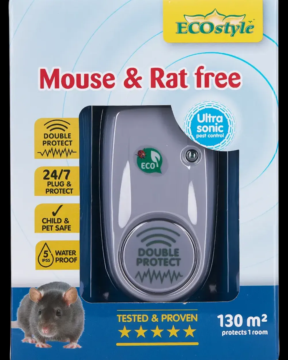 Mus og RotteFri Ultralydsskræmmer fra Ecostyle er en nem og dyrevenlig måde at blive fri for skadedyrene på. Bliv fri for mus og rotter i store rum inde og ude, f.eks. i køkkenalrum, kælder, garage og værksted.Effektiv mod mus og rotter.Double Protect: Varierende frekvens og elektromagnetiske impulser.Anvend inde og ude, f.eks. i køkken, kælder, kryberum og skur (IP55).Ikke farlig for børn, katte, hunde, fugle og fisk.Dækker et område op til 130 m².Sættes i stikkontakten.Brugsanvisning: Sæt Mus og RotteFri Ultralydsskræmmer i en stikkontakt nær gulv og væg, hvor mus og rotter typisk færdes. Når den grønne lampe lyser, er Mus og RotteFri Ultralydsskræmmer tændt. Den røde lampe indikerer, at Double Protection er aktiv og ultralydsskræmmeren skræmmer skadedyrene væk fra området samtidig med at afgive elektromagnetiske impulser, der får mus og rotter til at undgå at gnave i ledninger.Vær opmærksom på, at ultralyd ikke kan trænge gennem massive dele som f.eks. vægge, lofter, gulve eller møbler. Lyden dæmpes også af bløde tekstiler som gardiner og lignende. Vær derfor omhyggelig med at placere Mus og RotteFri Ultralydsskræmmer i et åbent rum, hvor lydbølgerne frit kan sprede sig.