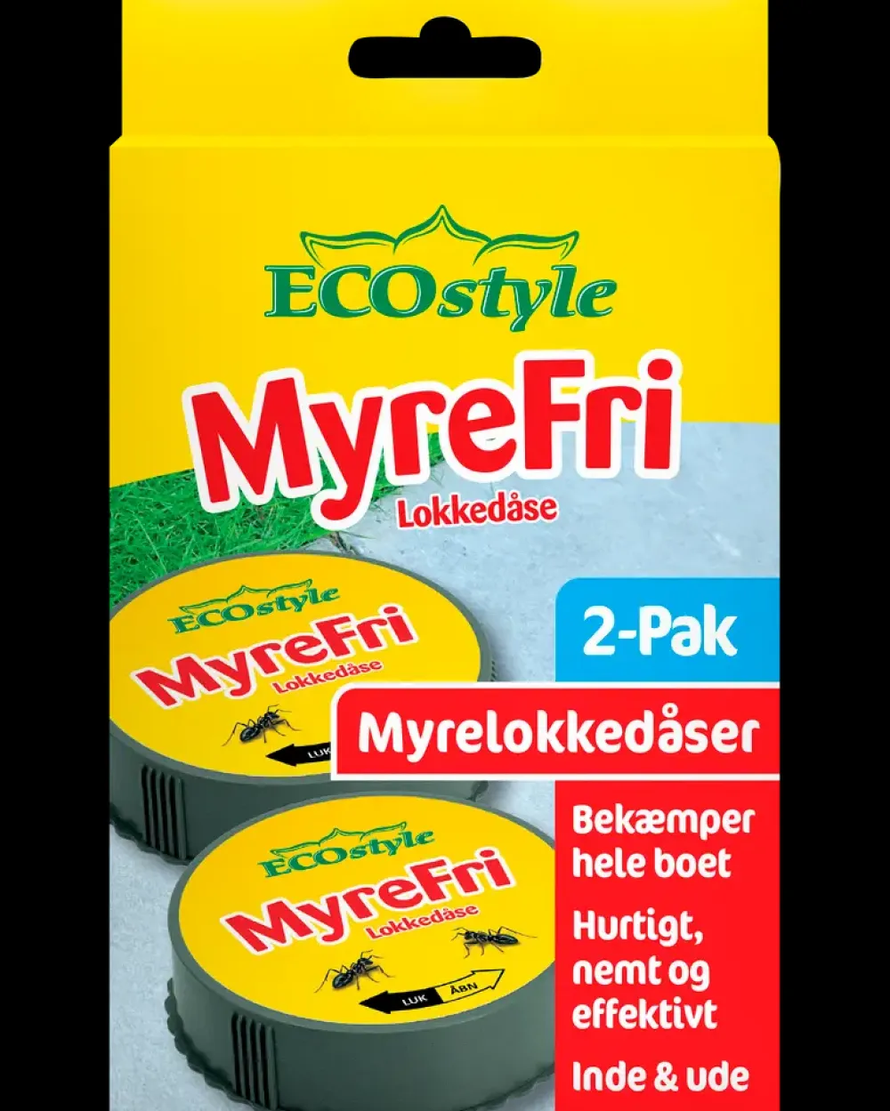 Myrelokkedåse i genbrugsplast indeholder det naturlige aktivstof, spinosad, som myrerne bringer med sig ned i boet. På den måde bekæmpes hele boet indefra. Pakken indeholder 2 lokkedåser. Lokkedåsen placeres der, hvor myrerne færdes. Lokkedåsen har børnesikring, men åbnes let ved at trykke på de markerede felter på siden af dåsen og dreje, så låget svinger op. Dåsen kan lukkes og åbnes igen efter behov.Må kun anvendes som insektmiddel mod sort havemyre (Lasius niger) som gel indendørs og som lokkedåse indendørs og udendørs. Må ikke anvendes mod andre skadevoldere og ikke i højere doseringer end de i brugsanvisningen nævnte. På grund af en risiko for forgiftning ved indtagelse, må produktet ikke anvendes i områder hvor børn, husdyr samt vilde dyr kan få adgang. Hylder, borde og andre flader, hvor levnedsmidler skal ligge eller opbevares, må ikke behandles og skal efter arbejdet omhyggeligt renses for eventuelle stænk og spild. Levnedsmidler, foderstoffer og drikkevarer må ikke forurenes. Må ikke tømmes i kloakafløb. Udendørs: Må kun anvendes på områder beskyttet mod regn. Opbevares utilgængeligt for børn og husdyr. Må ikke opbevares sammen med fødevarer, drikkevarer og foderstoffer.