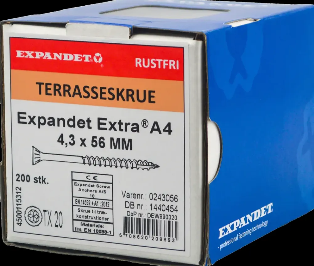 Expandet rustfrie A4 skruer med undersænket hoved og syrefast stål.Har fræseribber, delgevind og fibercut spids. Er CE-mærket for montage i bærende konstruktioner- og deklareret i anvendelsesklasse 3 for udendørs brug.Anvendes i terrassebrædder i blandt andet trykimprægneret træ med et højt indhold af blandt andet garvesyre ( eksotisk træ, lærk og eg).TX20 Diameter: 4,3 mmHoved diameter: 7 mmLængde: 56 mmGevind længde: 34 mm.