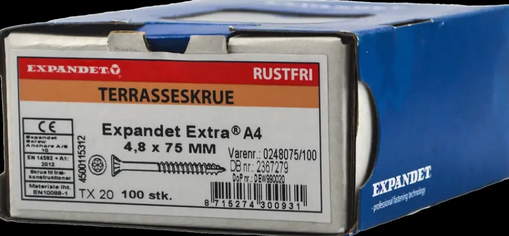 Expandet rustfrie A4 skruer med undersænket hoved og syrefast stål.Har fræseribber, delgevind og fibercut spids. Er CE-mærket for montage i bærende konstruktioner- og deklareret i anvendelsesklasse 3 for udendørs brug.Anvendes i terrassebrædder i blandt andet trykimprægneret træ med et højt indhold af blandt andet garvesyre ( eksotisk træ, lærk og eg).TX20 Diameter: 4,8 mmHoved diameter: 7,5 mmLængde: 75 mmGevind længde: 45 mm.