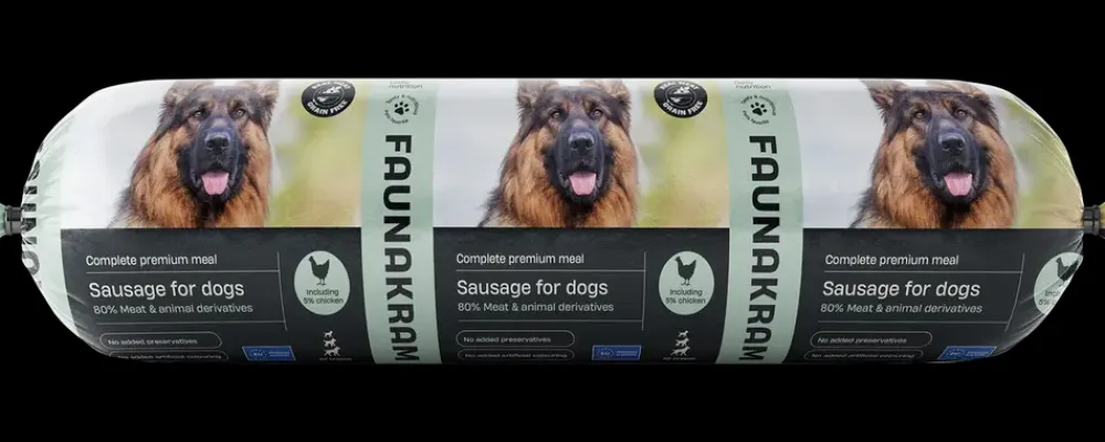Faunakram hundepølse, er et komplet vådfoder, der indeholder alle de vitaminer og mineraler, din hund har brug for. Du behøver således ikke at fodre din hund med andet end denne pølse. Vi anbefaler dog altid også at fodre med tørfoder, og give tyggeben, for at sikre hundens tandhygiejne.Pølsen indeholder 80% kød og animalske derivater (5% kylling).Produktet er udviklet i samarbejde med ernæringseksperter, dyrlæger og opdrættere for at sikre den højeste kvalitet.
