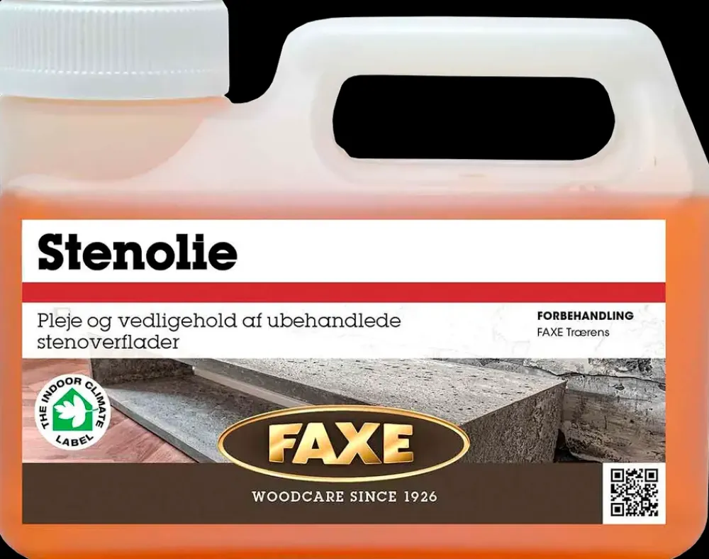 FAXE Stenolie er udviklet til pleje og vedligeholdelse af ubehandlede stenoverflader med åbne strukturer, som fx natursten, skifer, beton, klinker og terrazzo. Olien kan anvendes både indendørs og udendørs og beskytter effektivt mod fugt, snavs og pletter.Ved påføring trænger stenolien ind i overfladen og danner en stærk, vand- og smudsafvisende barriere uden at lukke stenen inde. Den fremhæver stenens naturlige farve og struktur, så overfladen får et dybere, mere levende udtryk.FAXE Stenolie er fremstillet på basis af forædlede planteolier og isoparraffin, hvilket giver en slidstærk og holdbar behandling. Olien er velegnet til både gulve, bordplader, vindueskarme og andre overflader, hvor man ønsker at bevare stenens oprindelige karakter og udseende.Farve: Klar (transparent)