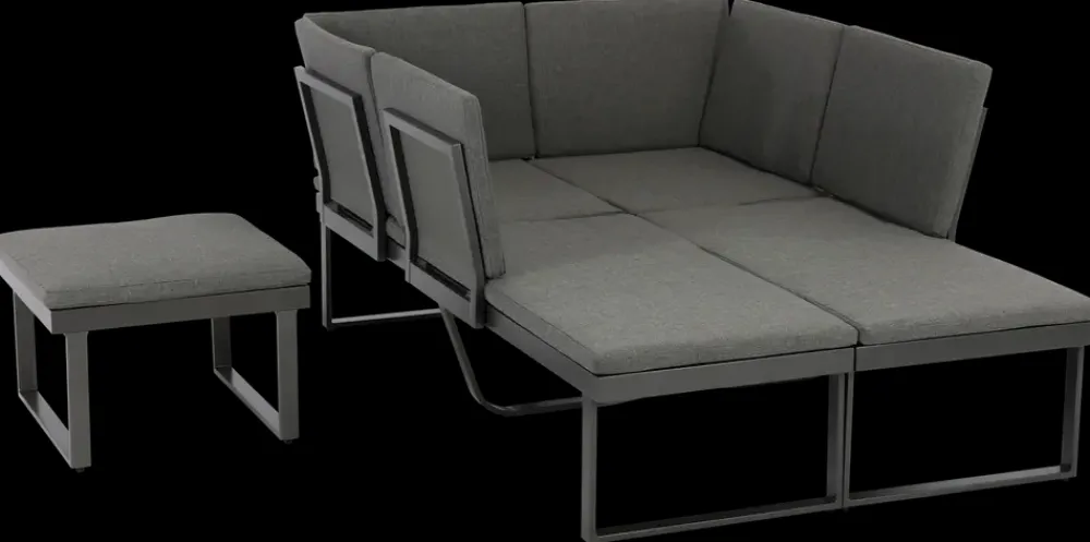 Alu Flex loungesætDette fleksible loungesæt i aluminium har indre stålelementer for øget stabilitet. Sættet består af 6 aftagelige ryglæn, 2 justerbare chaiselonger og 1 sidebord. Møblet kan nemt omdannes til forskellige former, f.eks. to daybeds, en stor daybed med sidebord eller to trepersoners sofaer med sofabord.Mål:Sofaer/chaiselonger: H. 70 x D. 64 x B. 176 cmSiddehøjde: 36 cm, Siddehøjde m/ hynde: 42 cm, Bord: H. 35,7 x B. 55 x L. 55 cmMaksimal belastning på bord: 50 kg.Maksimal belastning på hver stol: 110 kg.Sættet indeholder:Hynder6 aftagelige ryglæn2 justerbare chaiselonger1 sidebord