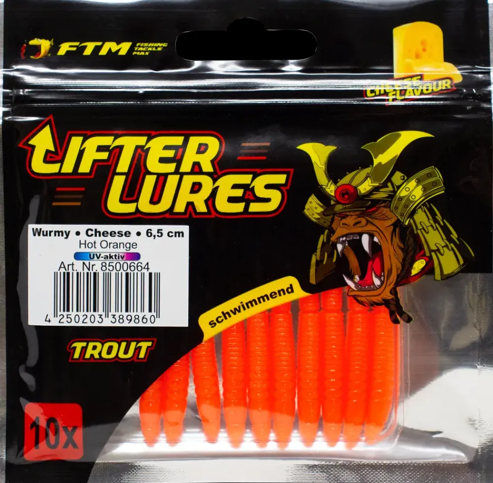 Lifter Lures Wurmy Cheese er et effektivt gummiagn til put and take-fiskeri.Den unikke ostearoma lokker ørreder og øger chancerne for fangst markant. Med en længde på 6,5 cm og en flydende egenskab kan Wurmy nemt fiskes med et bombarda-flåd eller frit i vandet. Det fleksible design skaber realistiske bevægelser og gør den synlig for fisk i alle vandlag. Perfekt til danske ørredvande og leveres i en pakke med 10 stk.