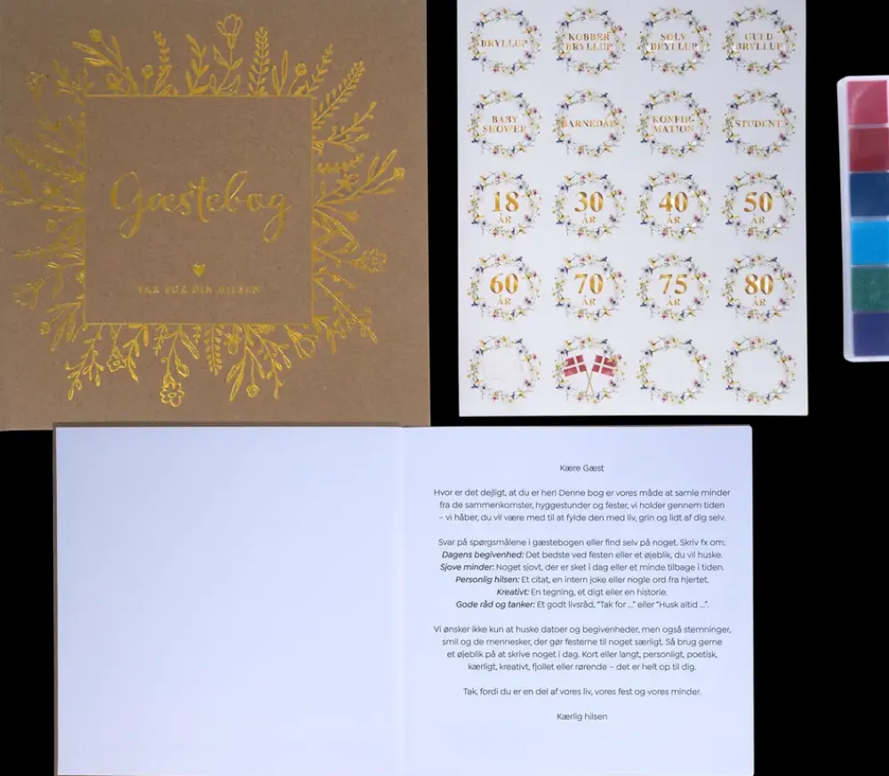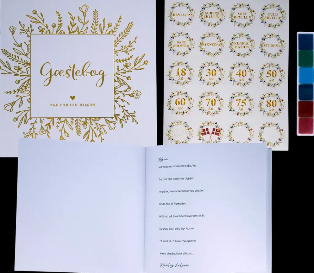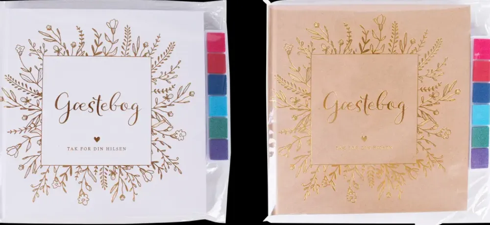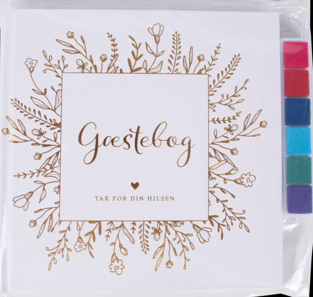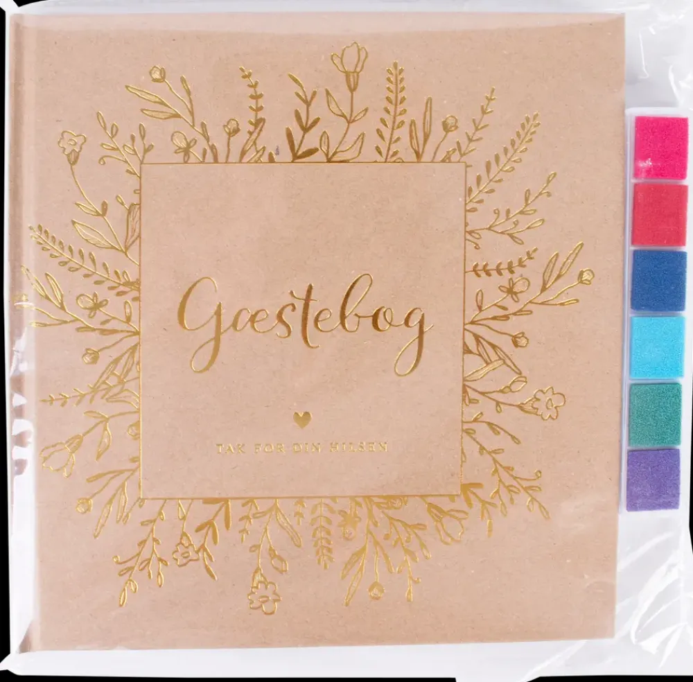 Gæstebog til hilsner, tegninger og personlige beskeder ved festlige begivenheder. Bogen giver mulighed for at samle minder fra bryllup, konfirmation, jubilæum eller andre mærkedage. Der medfølger stickers samt farver til fingeraftryk, som kan bruges til kreative indslag.Indersiderne er hvide og giver god plads til både tekst og små illustrationer. Omslaget fås i kraftigt brunt eller hvidt design med dekorativ forside. Bogen indeholder et forord med inspiration til udfyldelse, hvilket gør det nemt for gæster at komme i gang.