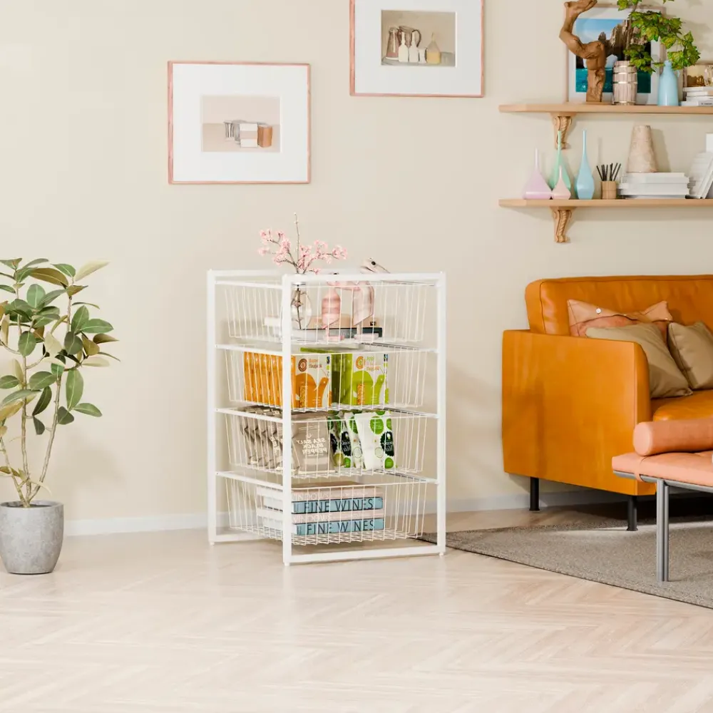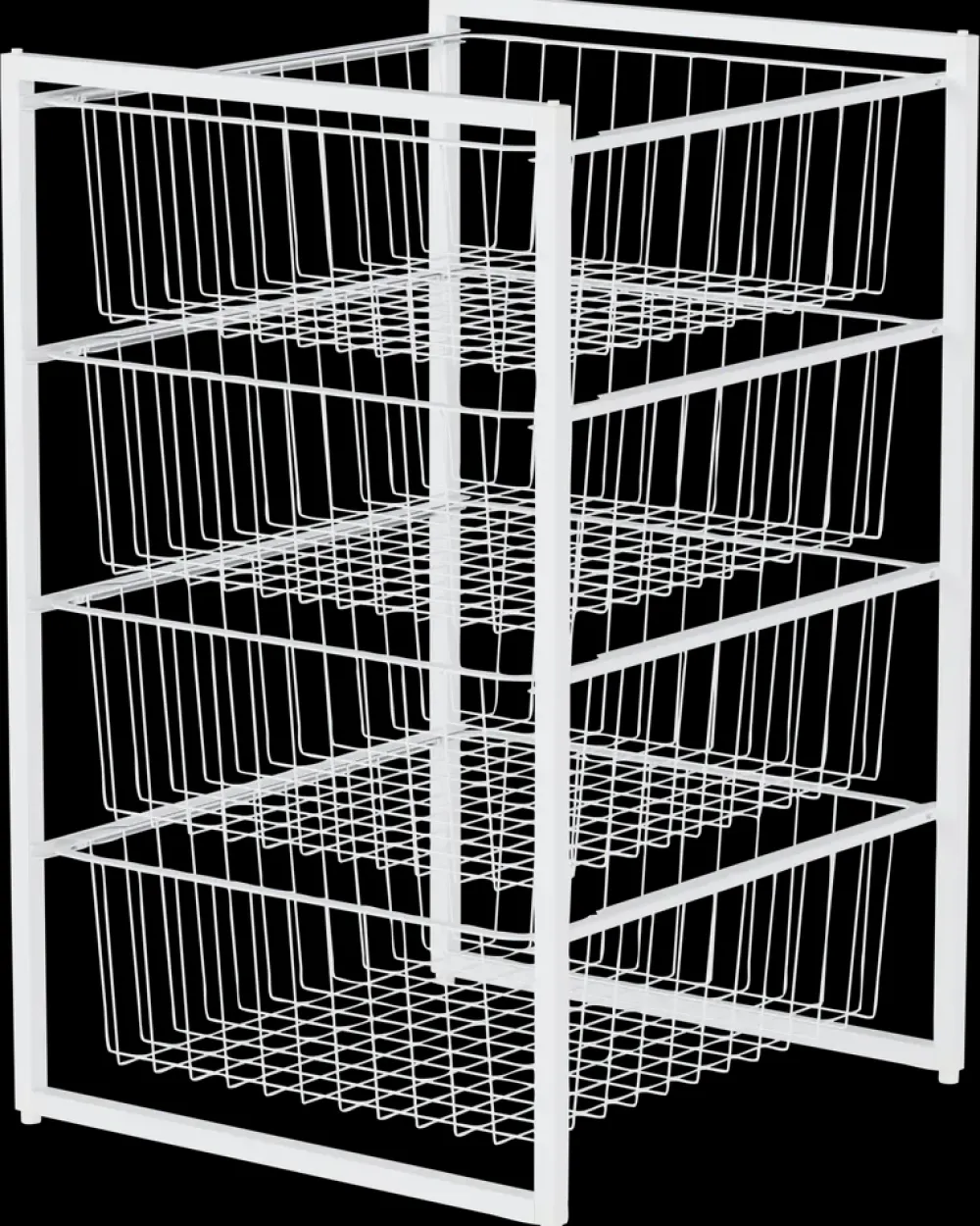 Opbevaringsreol med fire rummelige trådkurve, der giver godt overblik og nem adgang til indholdet. Den åbne konstruktion sikrer ventilation og egner sig til f.eks. tøj, legetøj eller rengøringsartikler.Reolen er fremstillet i plast (PP) og stål, hvilket gør den både stabil og let. Den leveres i få dele og er nem at samle.Mål: H69 x B43 x D45 cmFarve: HvidMateriale: PP og stål