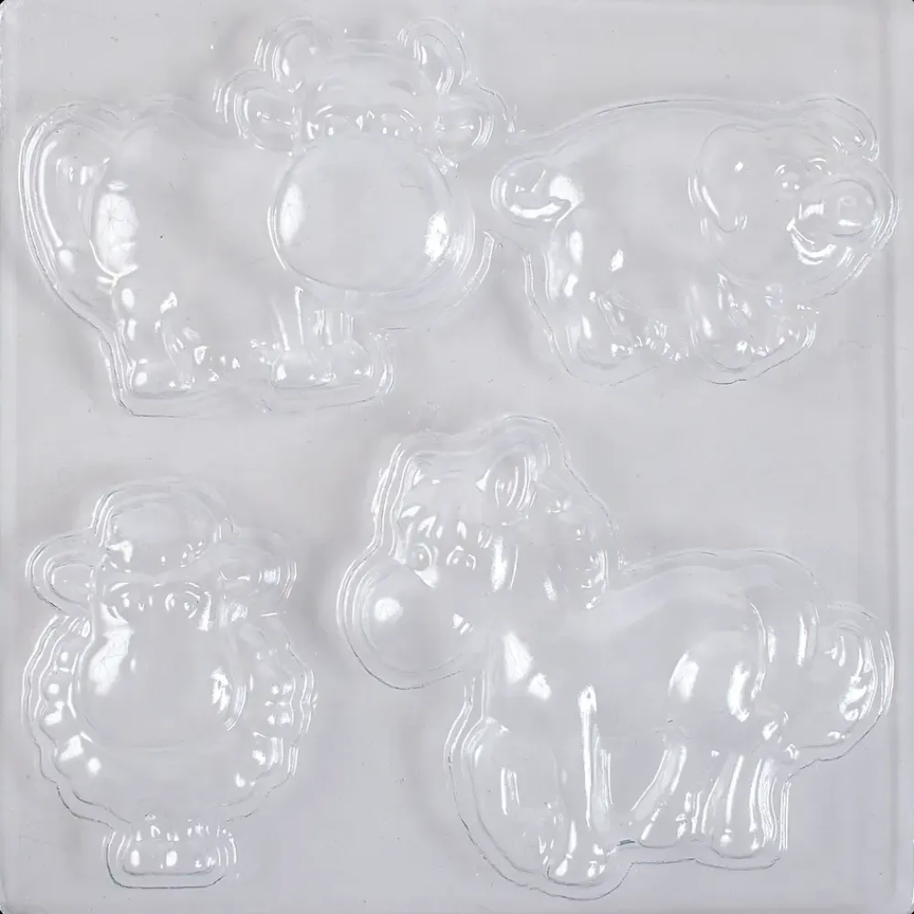 Gipsforme af fire forskellige bondegårdsdyr: gris, hest, ko og får. Når gipsen er tør, kan figurerne farvelægges med vandfarver, akrylmaling eller andre typer maling. Formen er fremstillet i gennemsigtigt PET-plast, hvilket gør det let at se, om gipsen er jævnt fordelt.