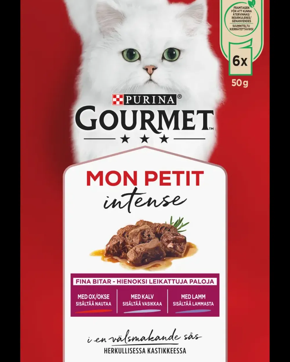 PURINA GOURMET Mon Petit Intense er vådfoder til voksne katte, opdelt i små portionsposer á 50 g. Produktet er udviklet til daglig fodring og gør det muligt at servere en frisk portion ved hvert måltid uden behov for opbevaring af rester.Foderet indeholder fine bidder med okse, kalv og lam i sovs, hvilket giver en blød konsistens, som mange katte foretrækker. De mindre portioner bidrager til en ensartet fodring og gør det let at dosere korrekt mængde. Produktet er fremstillet med udvalgte ingredienser og uden tilsatte farvestoffer. Portionsposerne er nemme at åbne og gør serveringen enkel i både hverdag og ved flere fodringer i løbet af dagen.Indhold: 6 x 50 g