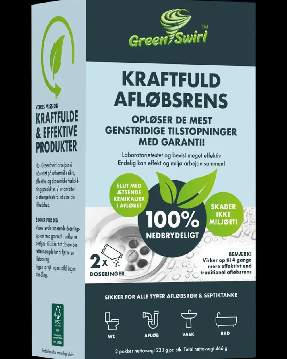 Green swirl er en kraftfuld og sikker afløbsrens, der ikke skader miljøet og er nedbrydeligt.Indeholder 2 doseringsposer à 233 g.Afløbsrensen virker op til 4 gange mere effektivt end traditionel afløbsrens.Rensen opløser de mest genstridige tilstopninger.