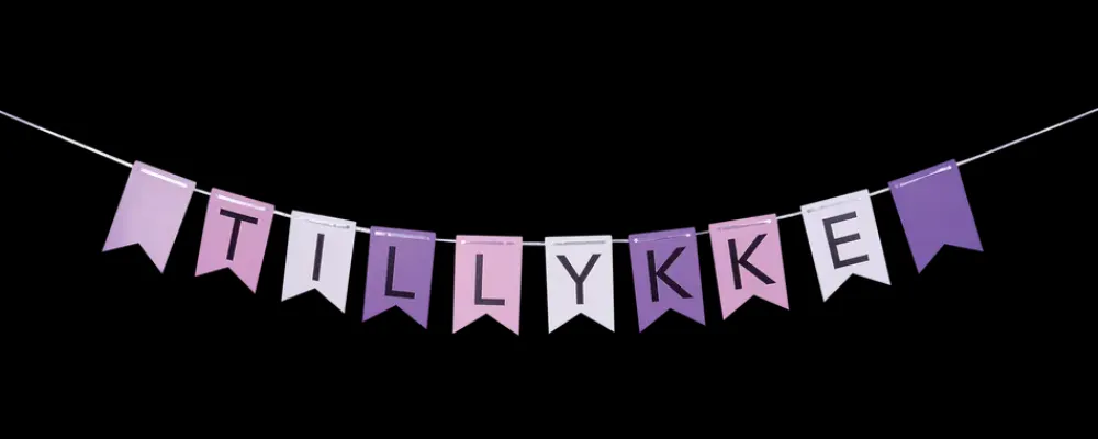 Guirlande med teksten ‘Tillykke’ – God til at fejre fødselsdage og andre specielle anledninger.Splitflagene måler 8 x 12 cm.DIY og skal samles selv.