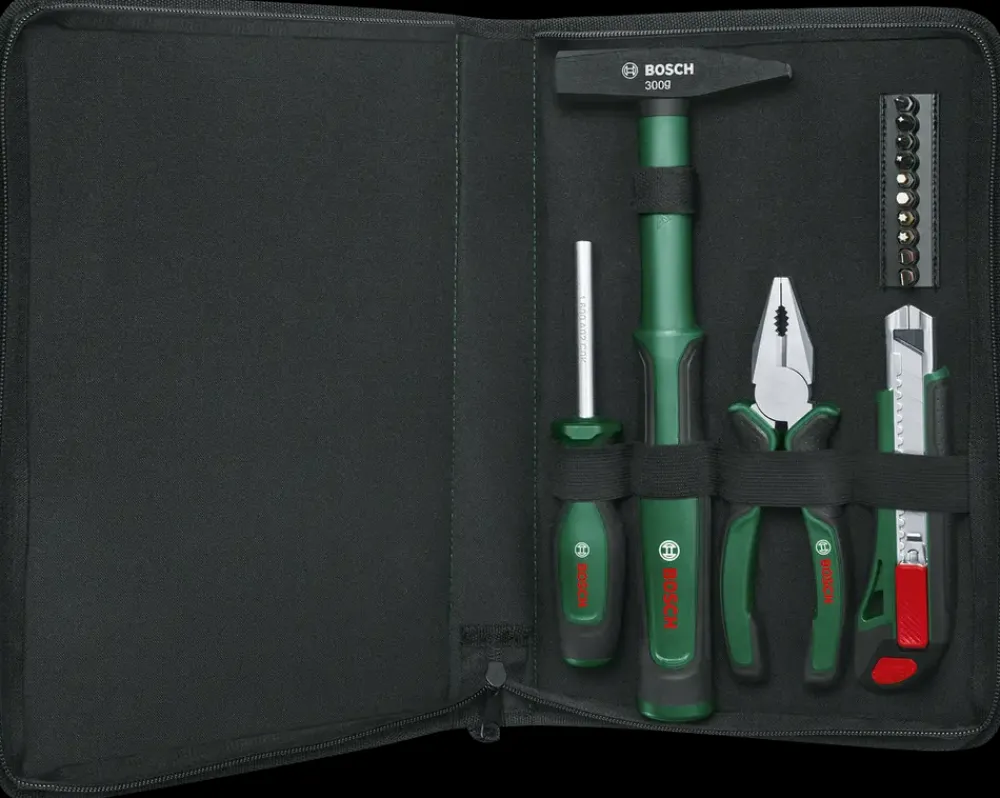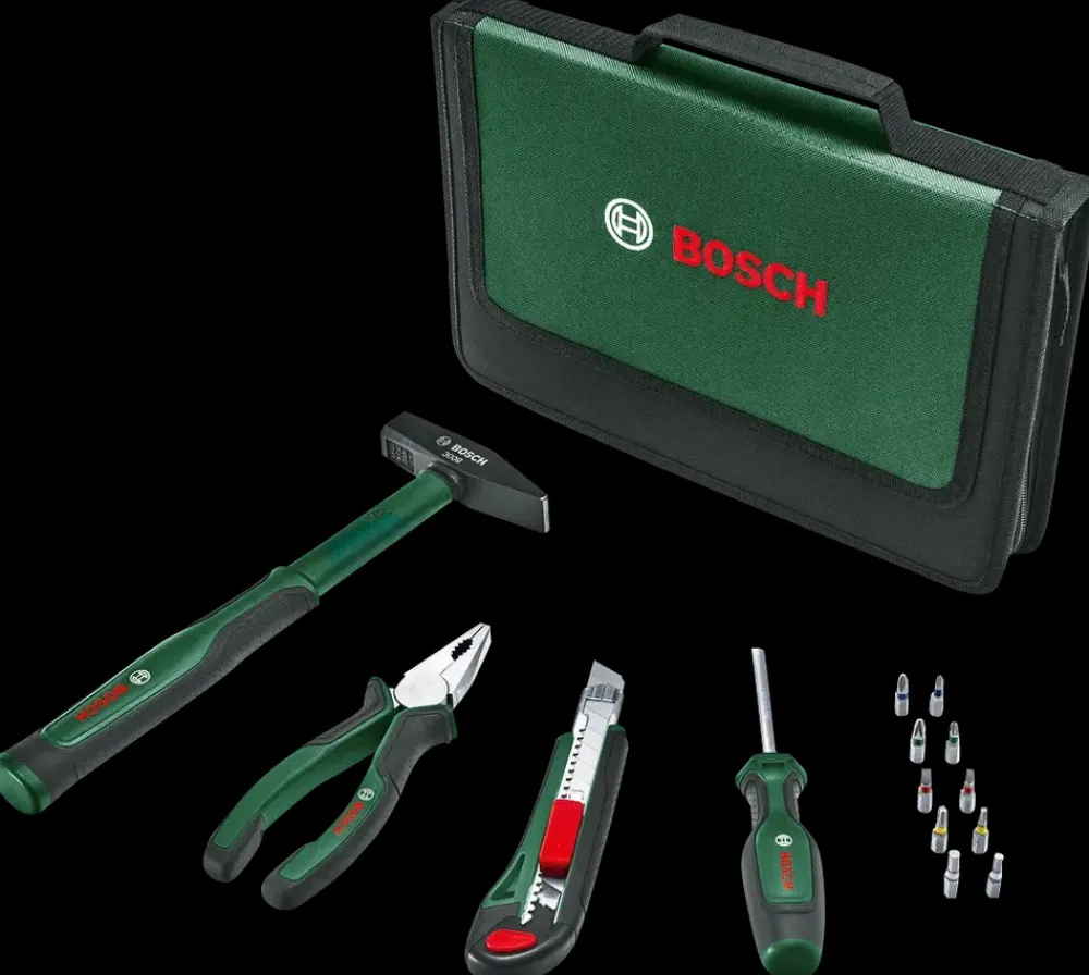 Bosch basishåndværktøjssæt, 14 deleDette sæt indeholder ideelle værktøjer til reparation, vedligeholdelse og møbelsamling. Leveres i en praktisk stoftaske med lynlås for nem opbevaring og transport.Indhold:Kombitænger – alsidigt greb og håndtering300g hammer – til præcise slagopgaverUniversalskruetrækker med 10 bits – til forskellige skruetyperKniv med afknækkelig klinge – for præcis skæringErgonomisk design sikrer et godt greb og reducerer belastning under brug. Velegnet til både gør-det-selv-entusiaster og professionelle, der ønsker et kompakt og pålideligt værktøjssæt.10 års garanti fra BoschBosch tilbyder en imponerende 10 års garanti på dette produkt. For at registrere din udvidede garanti, kan du finde vejledning under “Vejledninger og datablade”.
