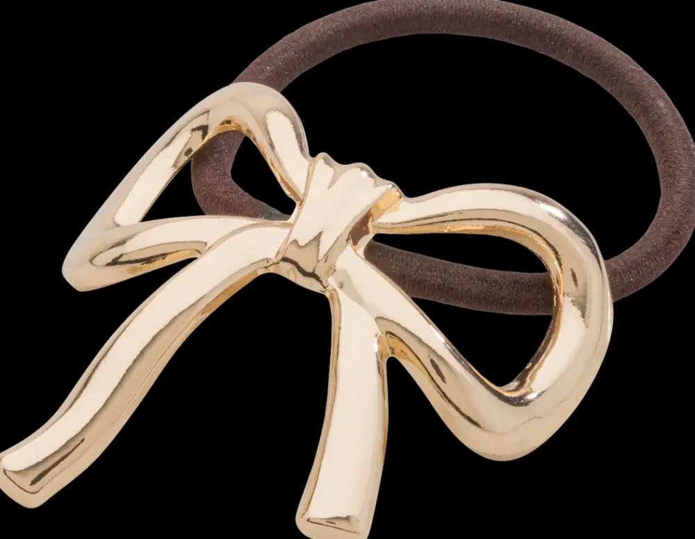 Hårelastik med en guldfarvet zinksløjfe, der giver en elegant og stilfuld detalje til frisuren. Perfekt til både hverdag og fest. Hårelastikken er fremstillet i zink og polyester og er nikkelfri. Ikke vandresistent – bør holdes fri for vand og kemikalier for at bevare sin finish.