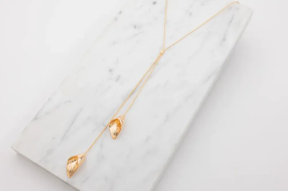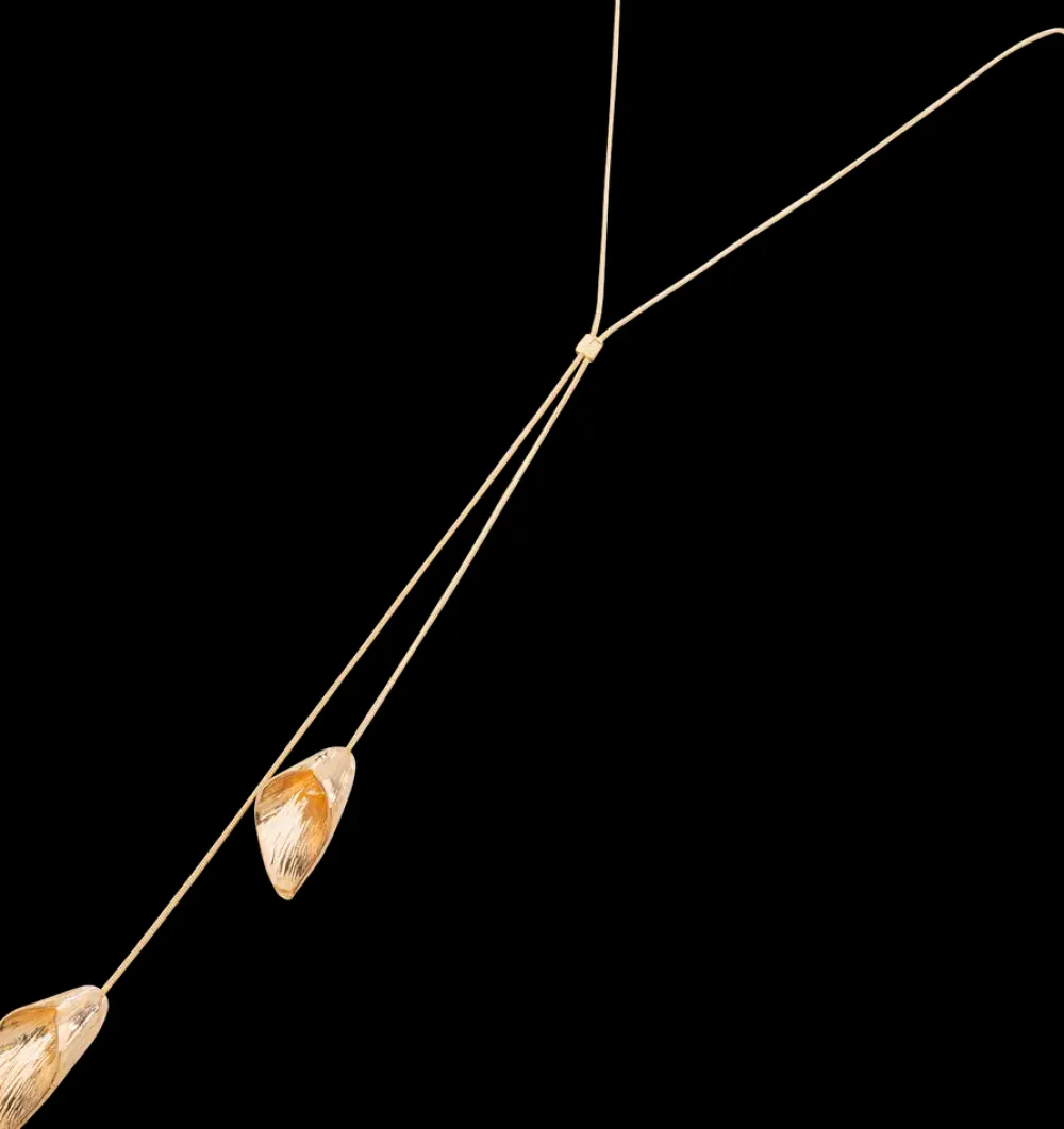 Elegant guldfarvet halskæde i et unikt design med to vedhæng formet som liljeblade. Den lange, tynde kæde samles i midten og skaber et feminint og stilfuldt udtryk. Justerbar lukning sikrer fleksibel pasform.Halskæden er nikkelfri og skånsom mod huden.Den er ikke vandresistent og bør opbevares tørt for at bevare dens glans og holdbarhed.