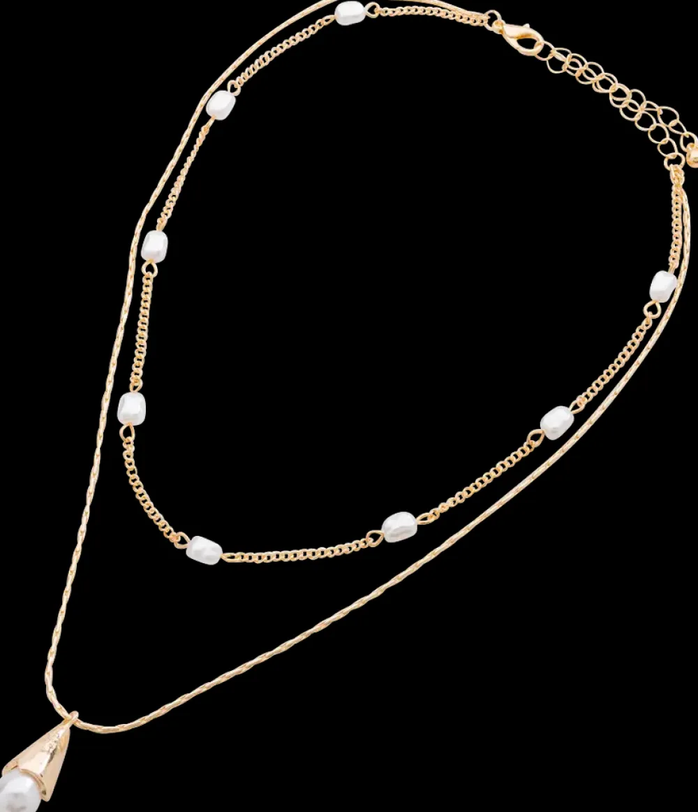 Elegant guldfarvet halskæde med et lagdelt design og dekorative perler. Den øverste kæde har små uregelmæssige perler, mens den nederste kæde har et vedhæng med en dråbeformet detalje. Justerbar lukning sikrer fleksibel pasform. Halskæden er nikkelfri og skånsom mod huden.Den er ikke vandresistent og bør opbevares tørt for at bevare dens glans og holdbarhed.