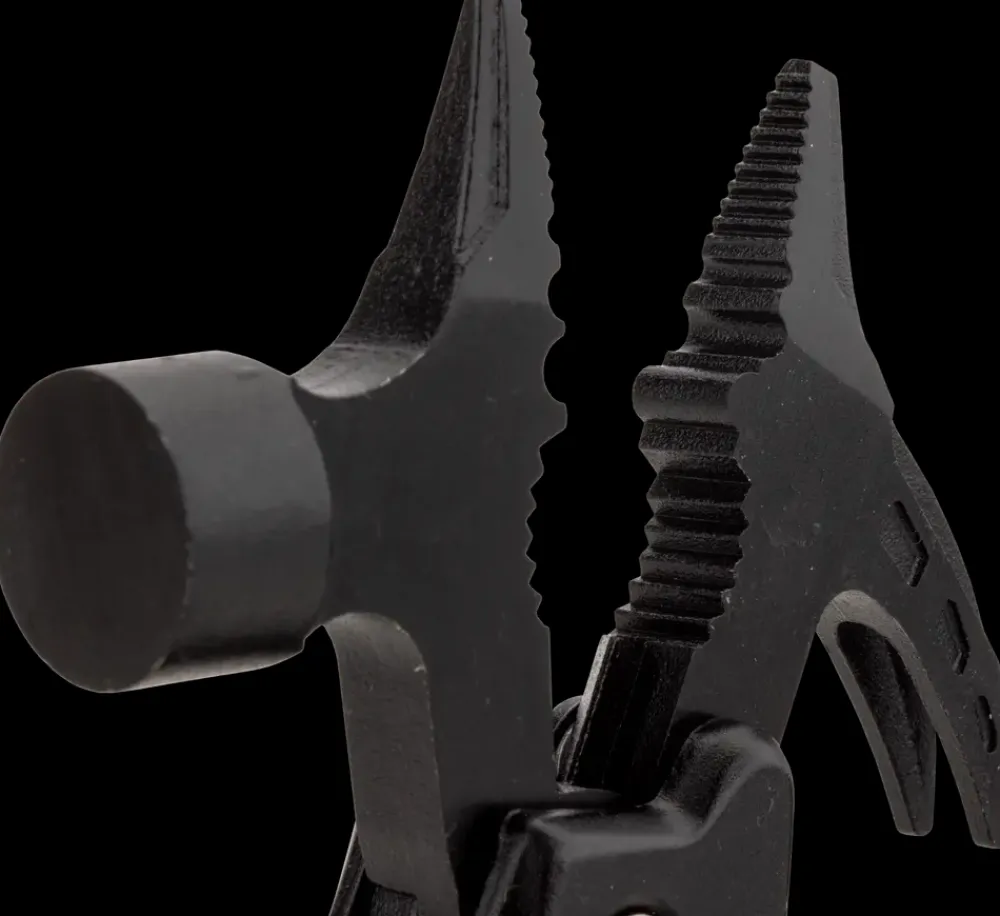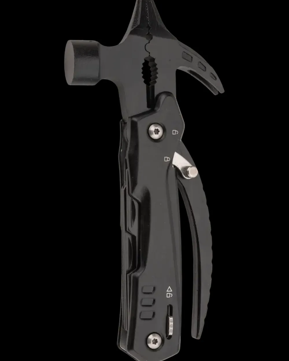 Multifunktionel hammer i rustfrit stål med 12 funktioner.Inkluderer spidstang, kombitang, trådskærer, hammer, klemme samt skruetrækkere til både lige kærv og stjerneskruer. Derudover har den tandkniv, neglefil, flaskeåbner, kniv og fil.Velegnet til både hjemmebrug og udendørs aktiviteter. Den kompakte størrelse på 15 cm og sorte finish gør den nem at transportere og opbevare.