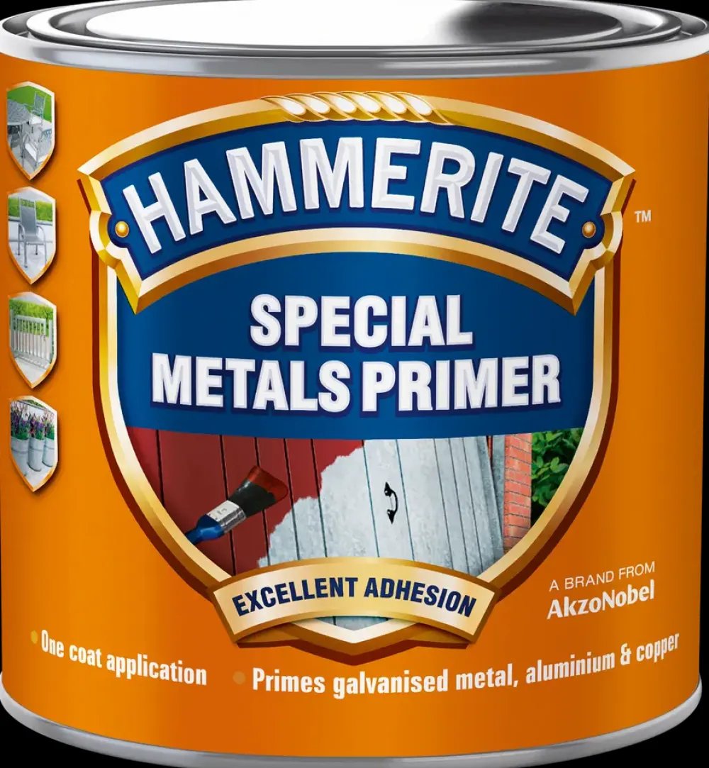 Hammerite Special Metals Primer er en hæftegrunder til metaloverflader, hvor der stilles krav til god vedhæftning før videre behandling. Produktet anvendes som grundlag på metaller som aluminium, galvaniseret jern, rustfrit stål, kobber, zink, messing og krom. Den danner en ensartet base, der forbedrer hæftningen for efterfølgende maling.Primeren er velegnet til både indendørs og udendørs brug og kan anvendes på eksempelvis gelændere, hegn, rør, beslag og andre metaldele. Ét lag er som regel tilstrækkeligt og kan overmales efter ca. 2 timer, hvilket giver en effektiv arbejdsproces.Produktet bruges som forbehandling inden videre maling med kompatible metalmalinger. For et ensartet slutresultat kan der efterfølgende males med Hammerite Glat, Hammer eller Semimat, afhængigt af ønsket overflade.Tekniske detaljer:Indhold: 250 mlFarve: RødAnvendelse: MetaloverfladerOvermalbar: Ca. 2 timer