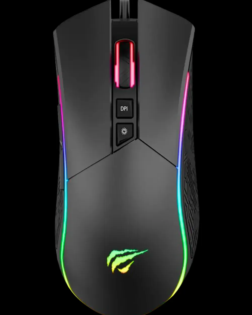 Gamermus fra Havit med RGB-lys og 7 knapper.Opløsningen kan justeres mellem 800-1600-2400-3200-4000-4800DPI.Musens indeholder 16 millioner lyseffekter, som vil skifte efter opløsningen.Lysene kan også tilpasses ved hjælp af softwaren i musen.