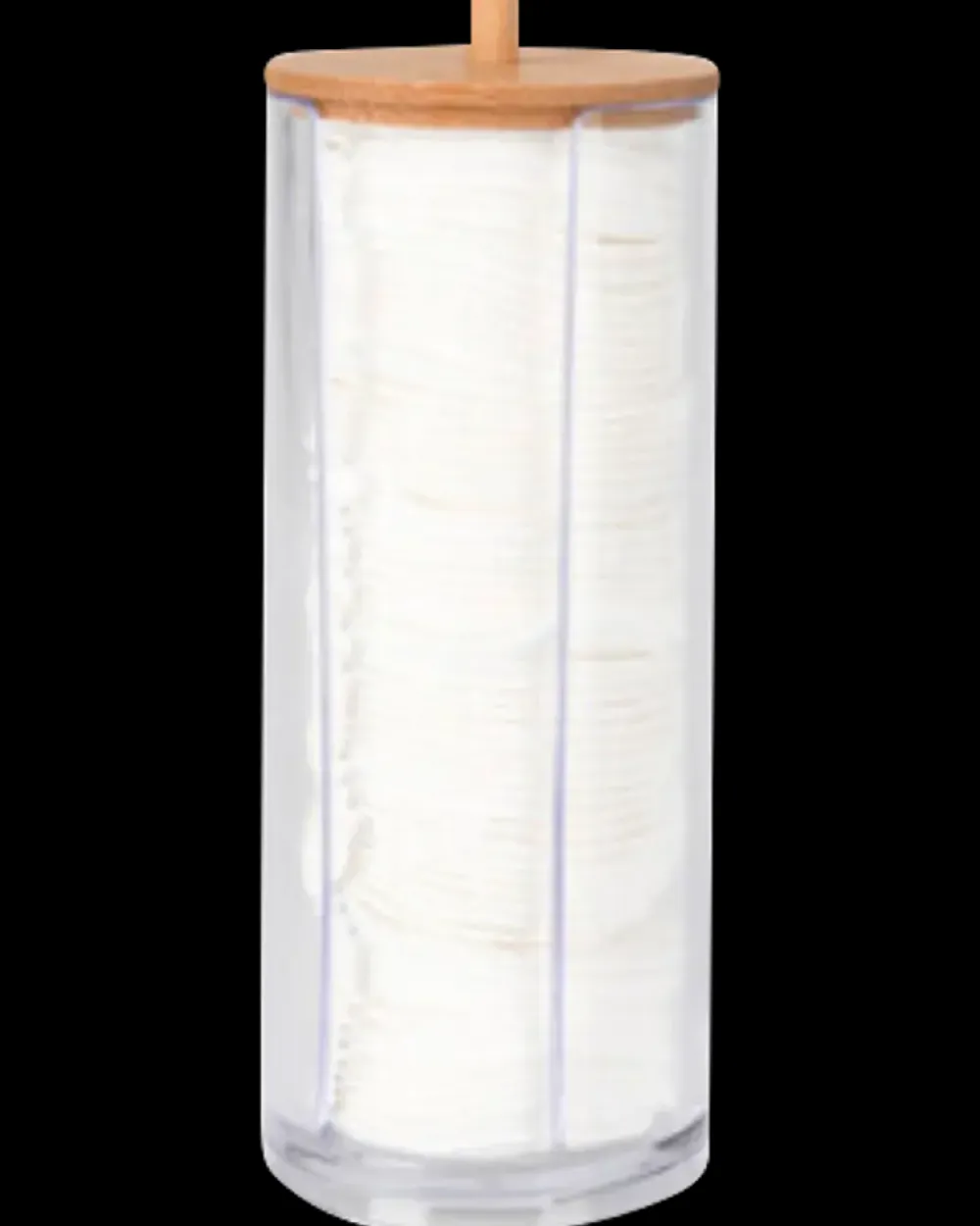 Praktisk holder til vatrondeller fremstillet i akryl med låg af bambus. Holderen har et tidløst og funktionelt design, der passer til de fleste badeværelsesindretninger. Med en højde på 18,5 cm og diameter på 7 cm er den kompakt og nem at placere. Holderen leveres med 70 stk. vatrondeller.