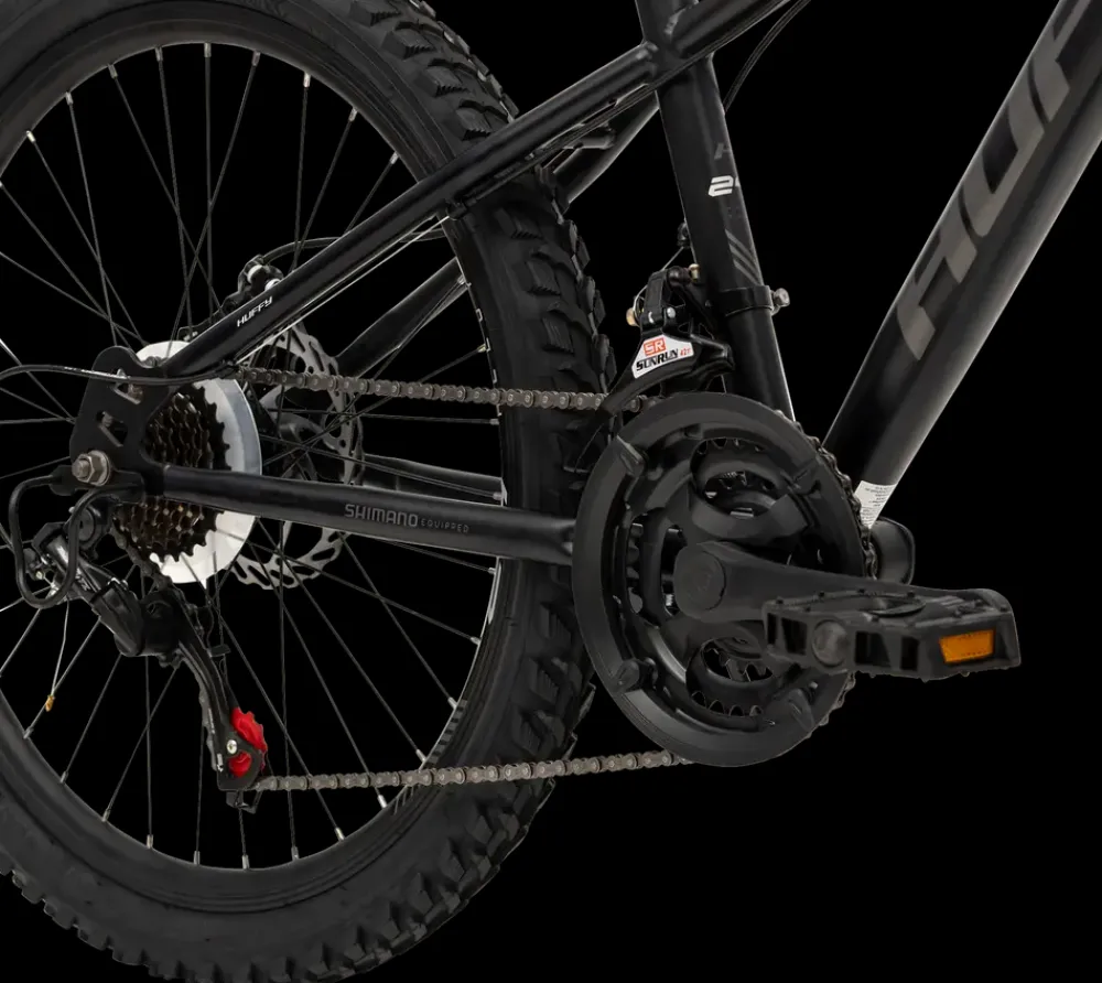Unisex-mountainbike til kørsel på stier og ujævne overflader. Udstyret med 21 Shimano-gear, som giver mulighed for at tilpasse modstanden under kørsel. Gearskiftet sker med tommelfingerskiftere for jævn betjening.Stålrammen har et X-frame-design, som giver stabilitet i varieret terræn. Forgaflen er med fjeder, der dæmper rystelser fra underlaget. Mekaniske skivebremser for og bag giver kontrolleret opbremsning.Cyklen har 24″ hjul og er egnet til cyklister på cirka 8–12 år med en højde omkring 127–135 cm. Dækkene har tydeligt mønster, og sadel samt styr kan justeres efter behov. Den sorte ramme har ensartet finish og tydelig modelmarkering. Reflekser er monteret for, bag og på hjulene. Pedalerne har rillet overflade og integrerede reflekser.