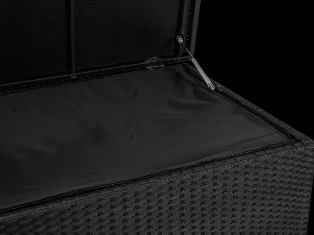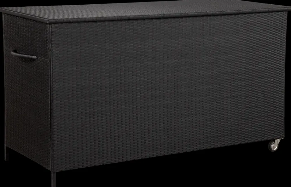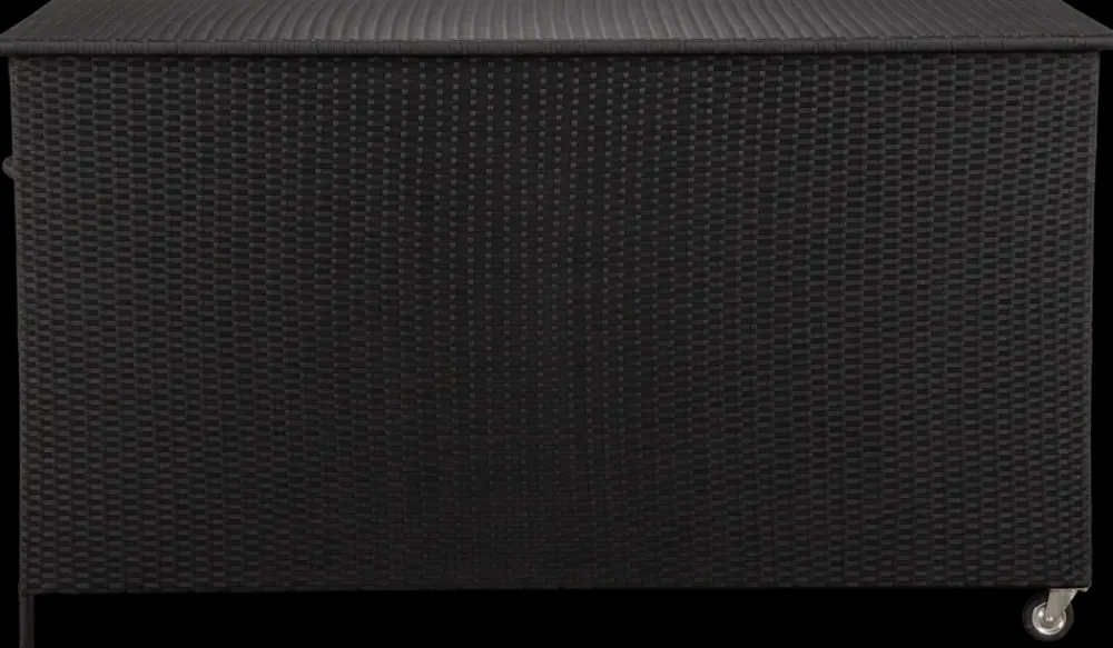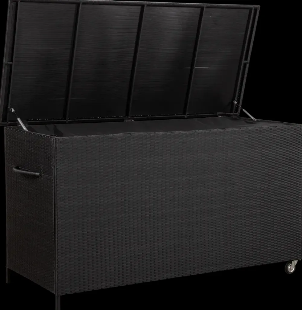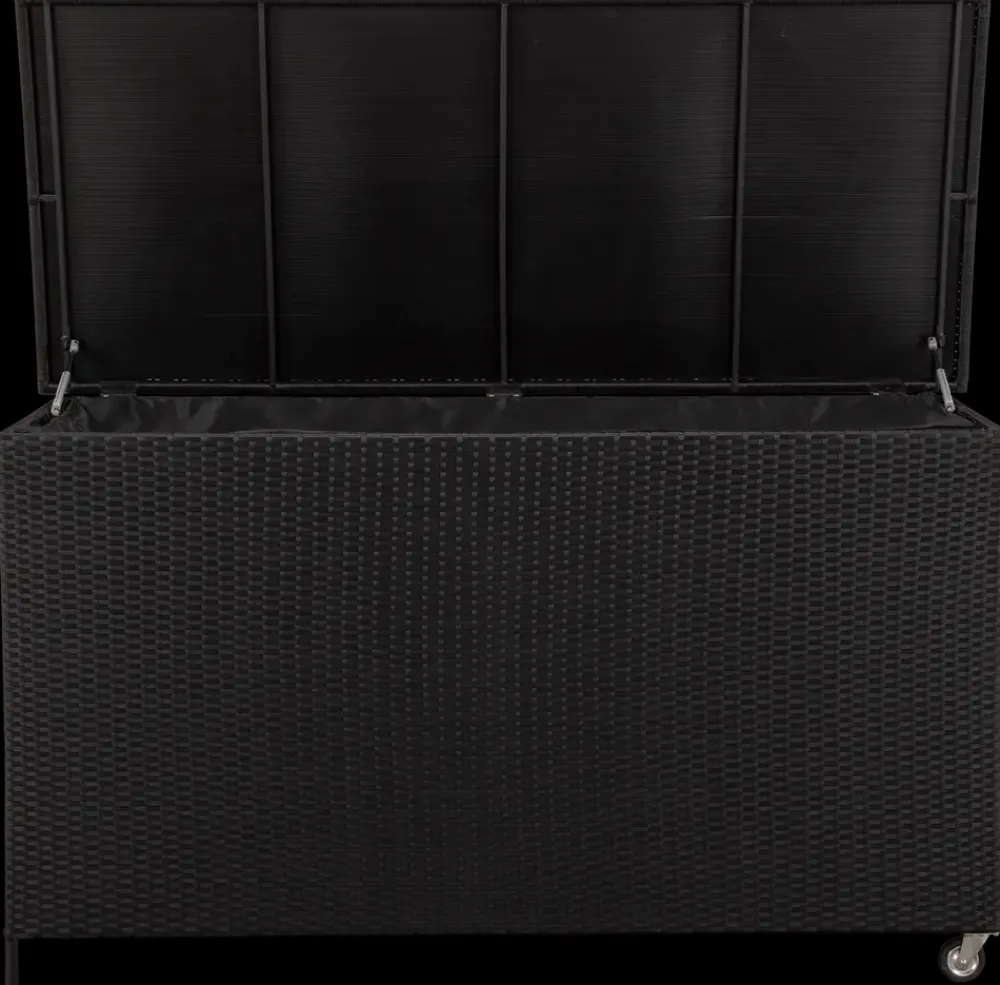 Praktisk hyndeboks i sort polyrattan og sort pulverlakeret galvaniseret stål.Hyndeboksen kommer med en vandtæt opbevaringspose med velcro og lynlås.Boksen er udstyret med hjul og praktisk trækhåndtag så den let kan flyttes.Materiale, hyndeboks: Polyrattan og galvaniseret stål.Materiale, pose: Sort polyester.Indvendige mål: H. 83,5 x B. 160 x D. 72 cm.