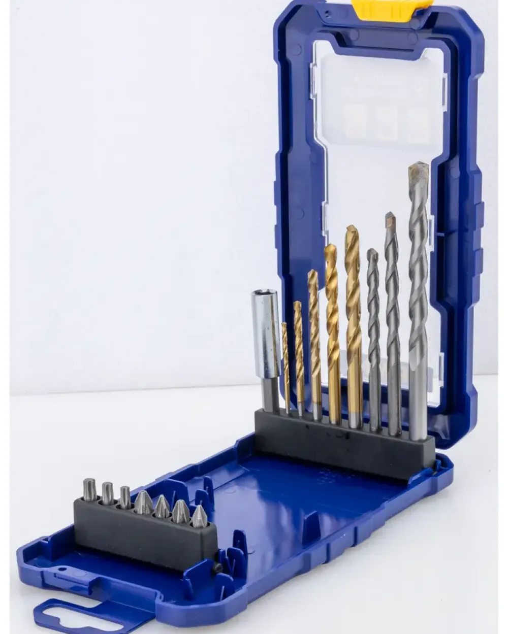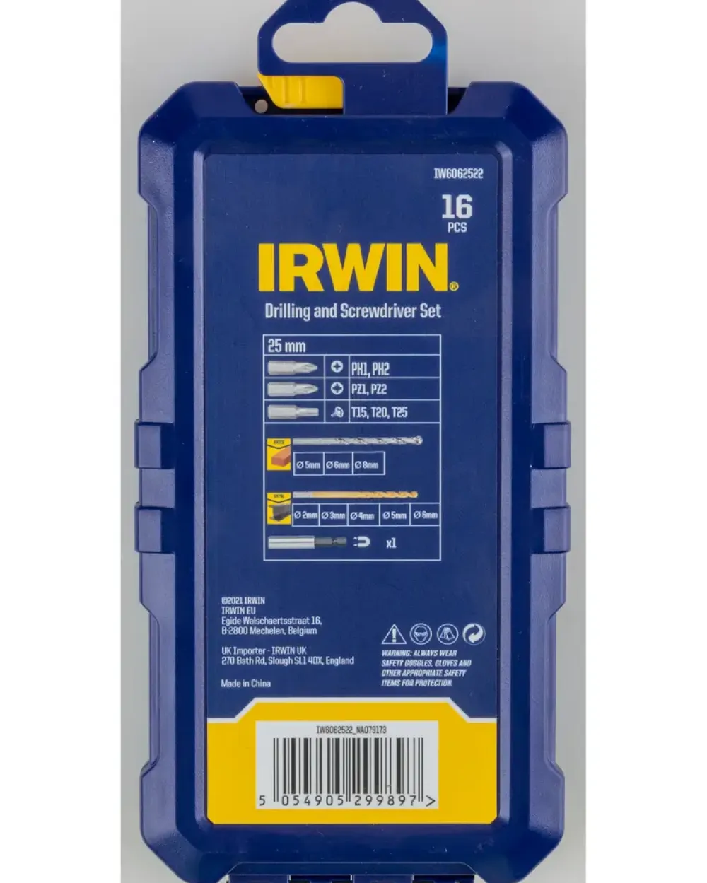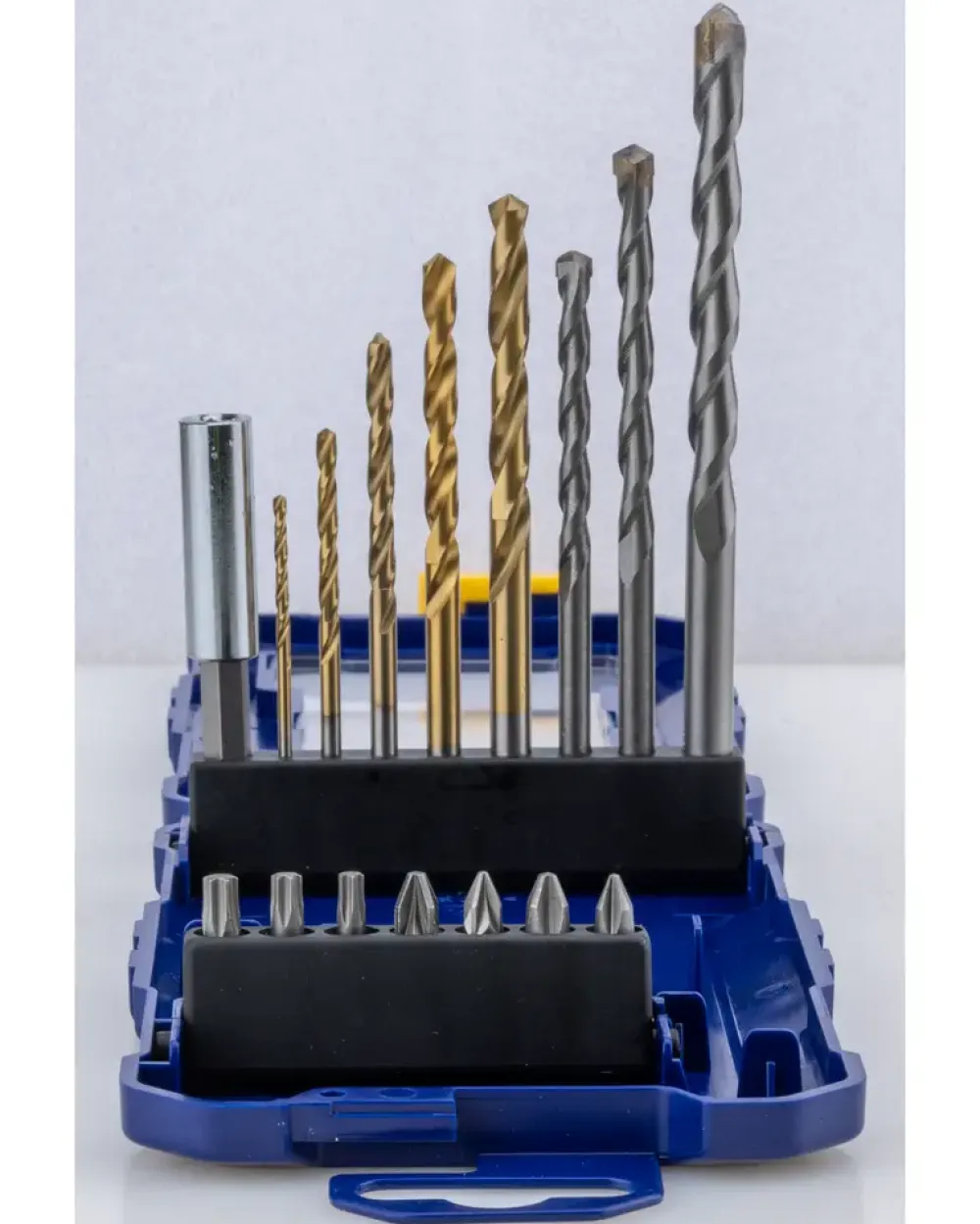 Bor-bitssæt fra Irwin indeholder:5 x metalbor: 2, 3, 4, 5, 6 mm. 3 x murbor: 5, 6, 8 mm 2 x 25 mm Phillips Bits: PH1, PH2 3 x 25 mm Pozi Bits: PZ1, PZ2, PZ3 2 x 25 mm lige kærv: 4,0, 6,0 mm 1 x magnetisk bitholder