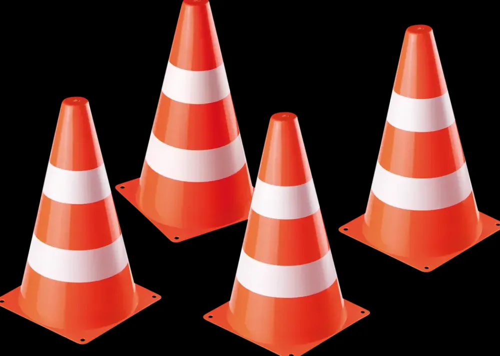 Sæt med 4 plastkegler i de klassiske farver; orange med hvide striber. Ideelle til boldspil i haven, forhindringsløb, cykeltræning og lignende.