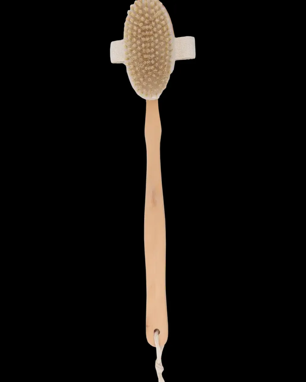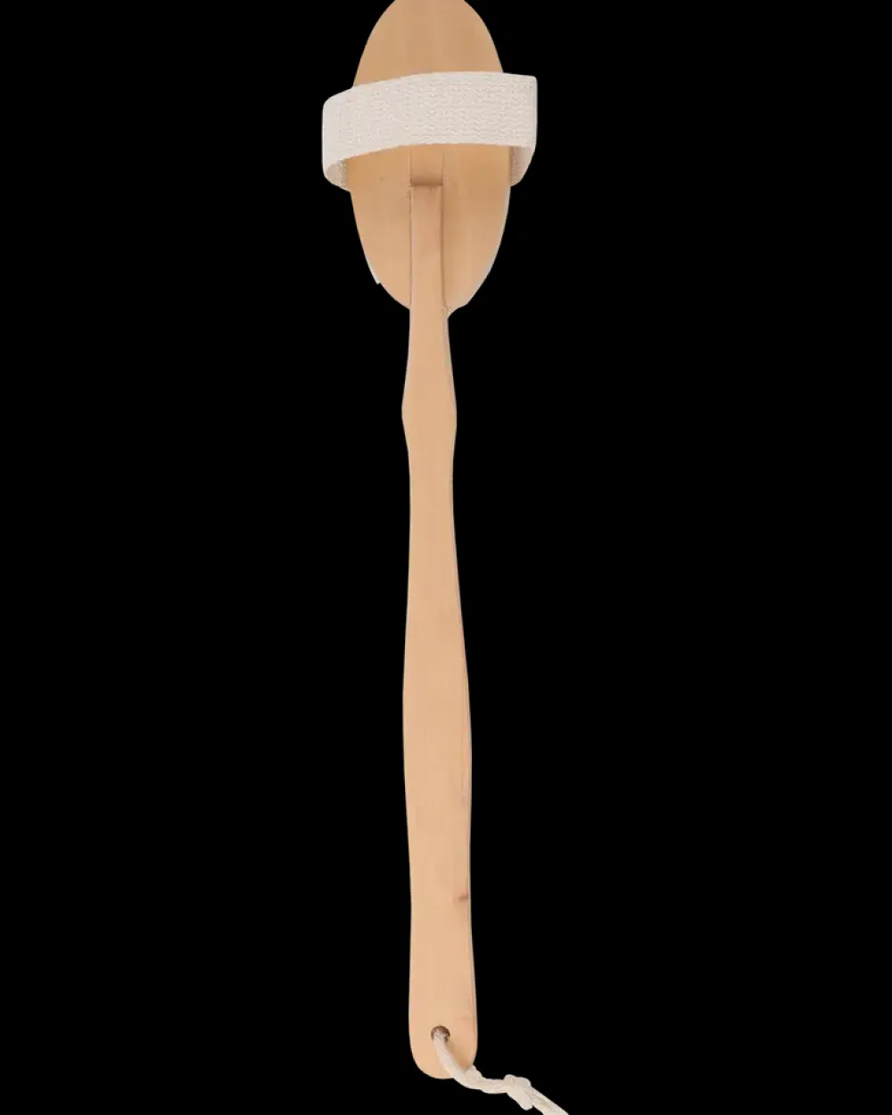 Badebørste i naturligt lotustræ med aftageligt børstehoved, der kan anvendes både til tørbørstning og i badet. Børsten gør det nemt at nå ryggen og andre svære områder på kroppen. De faste børster giver en grundig rengøring og stimulerer huden, hvilket kan bidrage til øget blodcirkulation. Det aftagelige hoved har en praktisk strop, så det kan bruges direkte i hånden. Børsten har en naturlig træoverflade og en ophængssnor i enden af skaftet, så den kan hænge til tørre efter brug.Længde håndtag: 30 cm.Samlet længde: 43,5 cm.Materiale: Lotustræ og bomuld.Farve: Naturtræ.