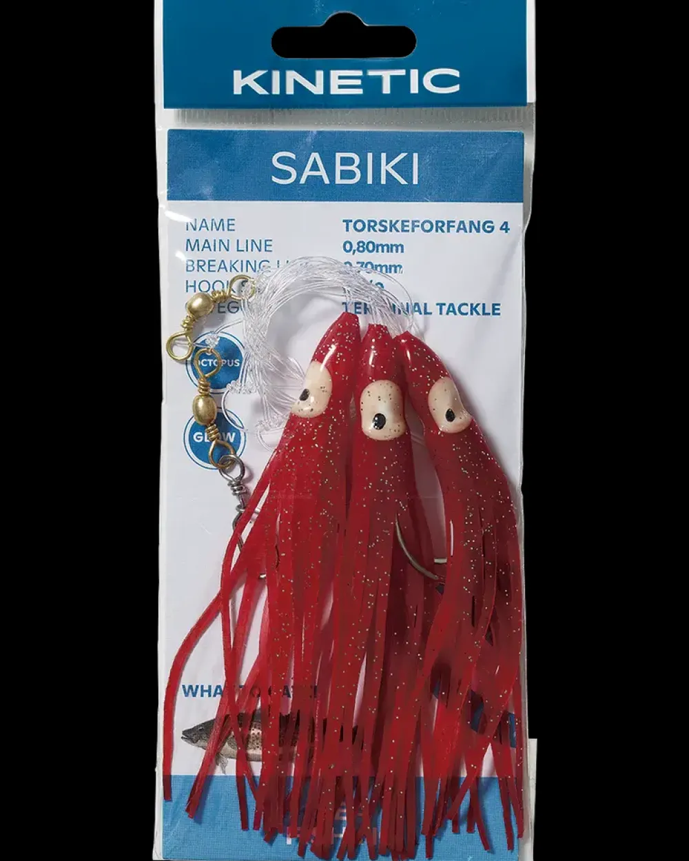 Dette rig, med blæksprutter af silikone, er en af verdens mest populære kombinationer. 3 stærke kroge kombineret med storfangende farver og kvalitets nylonline. Kvalitets nylonline Kemisk skærpede kroge Blæksprutter af silikoneTorsk, hvilling og sej