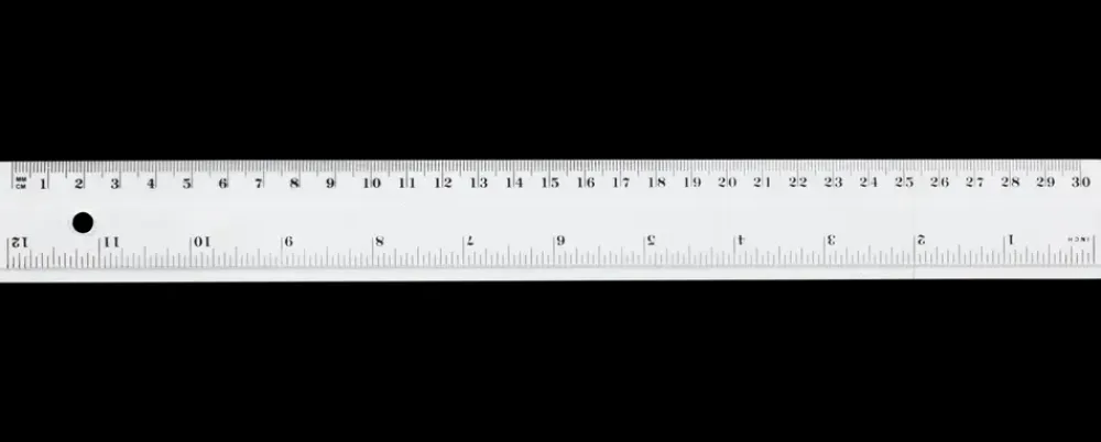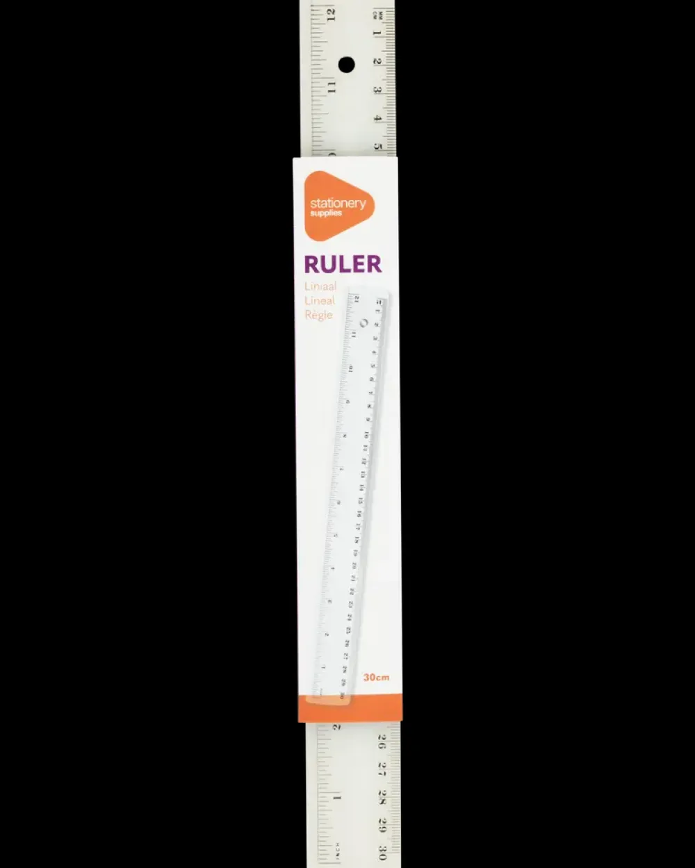 Klassisk transparent lineal til skolen, kontoret eller hjemmet.Linealen måler 30 cm og angiver millimeter, centimeter og tommer.Linealen er fleksibel.