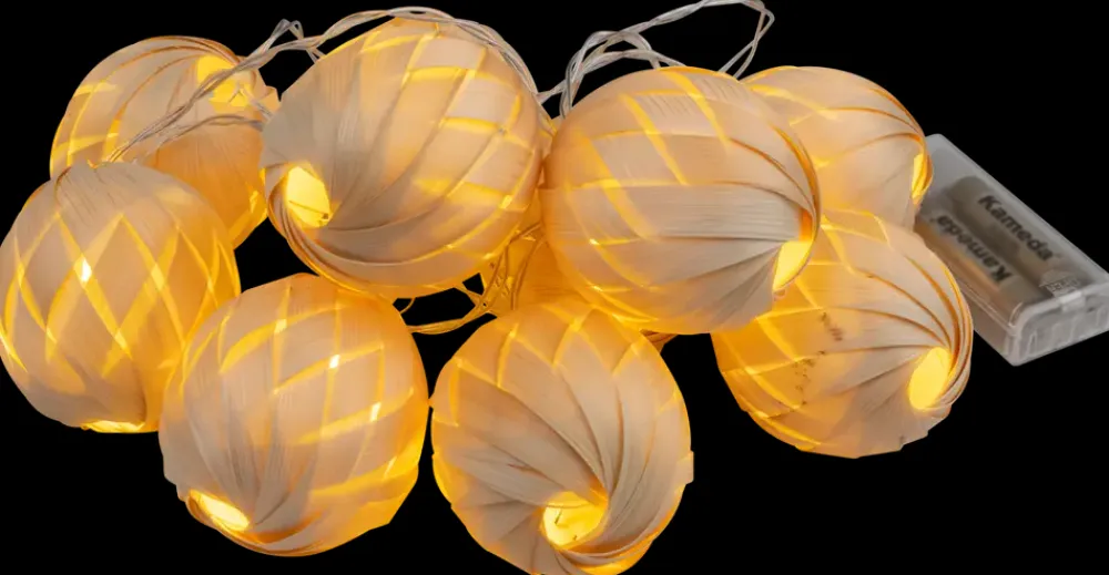 Dekorativ lyskæde med 10 LED-pærer, der er omkranset af små, fine bambuslanterner. Lyskæden skaber en hyggelig atmosfære med et varmt, hvidt lys. Til indendørs brug.Bruger 2xAA batterier (medfølger ikke).