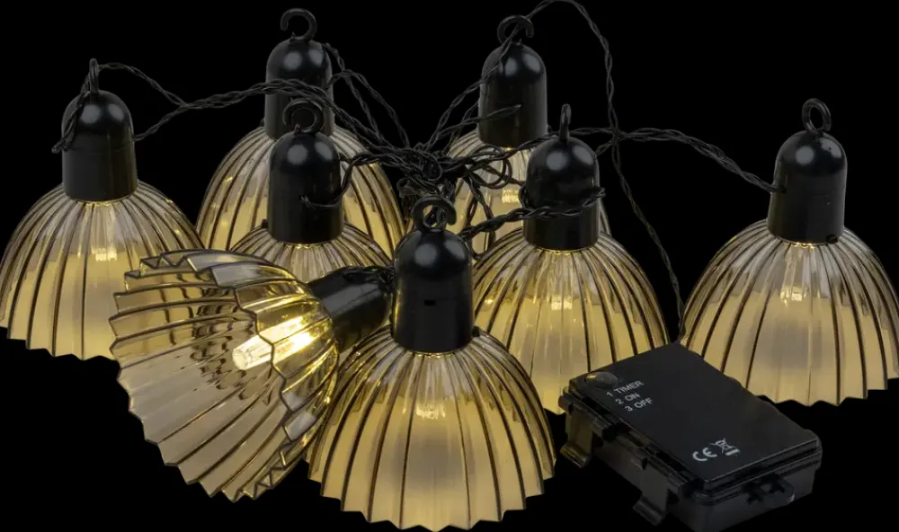 Dekorativ lyskæde med 8 små lamper i røgfarvet plast. Hver lampe har en krog til ophæng, så du nemt kan skabe den ønskede stemning i haven eller til fest.Lyskæden er batteridrevet med timerfunktion, der sparer på energien og forlænger batteriets levetid. Den er velegnet til udendørs brug med en IP44-klassificering.