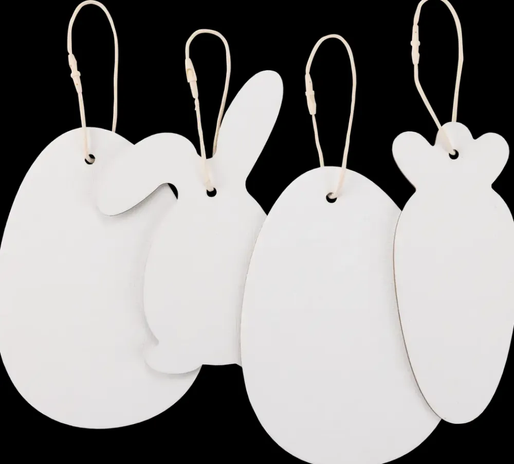 Disse lærreder med hul til ophæng er en kreativ aktivitet til påsken.Pakken indeholder fire lærreder i forskellige figurer: to påskeæg, en gulerod og en hare. Der medfølger snor, så de færdige dekorationer nemt kan hænges op i hjemmet. Lærrederne måler 11 x 15 cm og giver rig mulighed for at lave personlige påskepynt, der kan males og dekoreres af både børn og voksne.