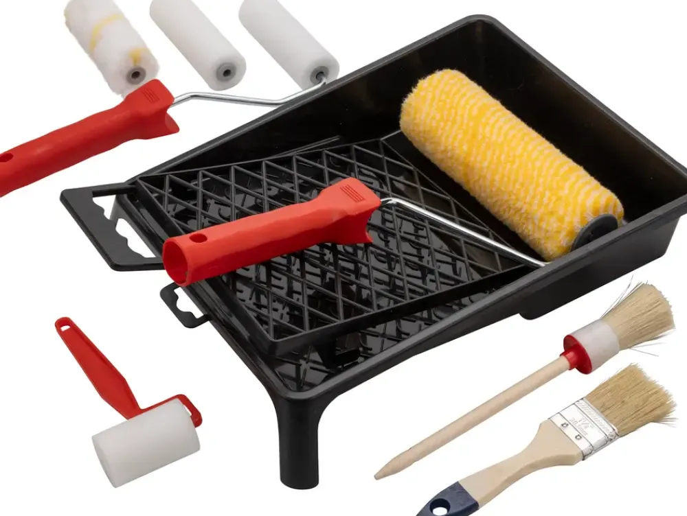 Komplet malersæt bestående af:1 stk. malerbakke.3 stk. rulleskafter.1 stk. skum valser: B. 5 cm.2 stk. skumvalser: B. 10 cm.1 stk. perlonvalser: B. 10 cm.1 stk. perlonvalser: B. 15 cm.1 stk. flad pensel.1 stk. rund pensel.1 stk. afstryger gitter
