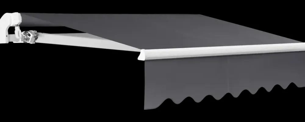 Manuel åben markise med hvidt stel og grå PU-coated polyesterdug.Markisen har et elegant og klassisk design og er nem at sætte op.Markisen har en bredde på 395 cm og et udfald på op til 250 cm.
